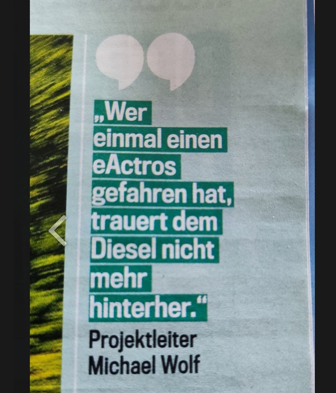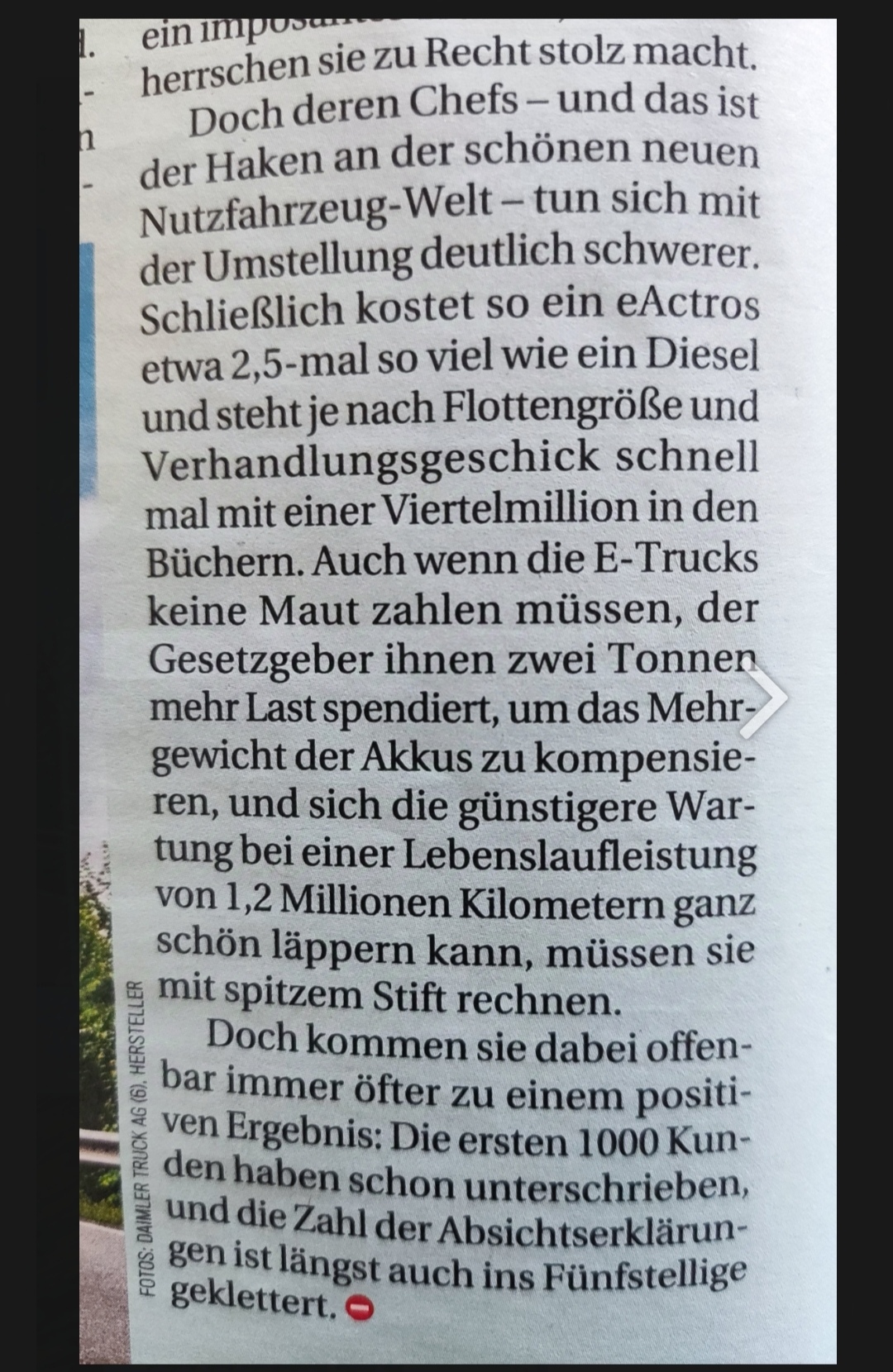 Kürzlich habe ich einen Bericht gelesen, leider weiß ich die Quelle nicht mehr, die eine recht smarte Art der Umrüstung auf "E-LKW" gezeigt hat: Anhänger, die am Königszapfen die Beschleunigungen messen und wo im Auflieger Akkus und Motoren verbaut sind. Zulassungsrechtlich dürfen Anhänger nie schieben, aber sie dürfen "unterstützen", so wie beim E-Bike (nein, Pedelec!) quasi, wo man auch mittreten muss. Aber die Kisten kommen halt jede Steigung mit 80 km/h hinauf und sparen so massiv Zeit - und da Zeit bekanntlich Geld ist, scheint das für "rechnende Spediteure" ein Punkt zu sein, der ernsthaft in Erwägung zu ziehen ist.
