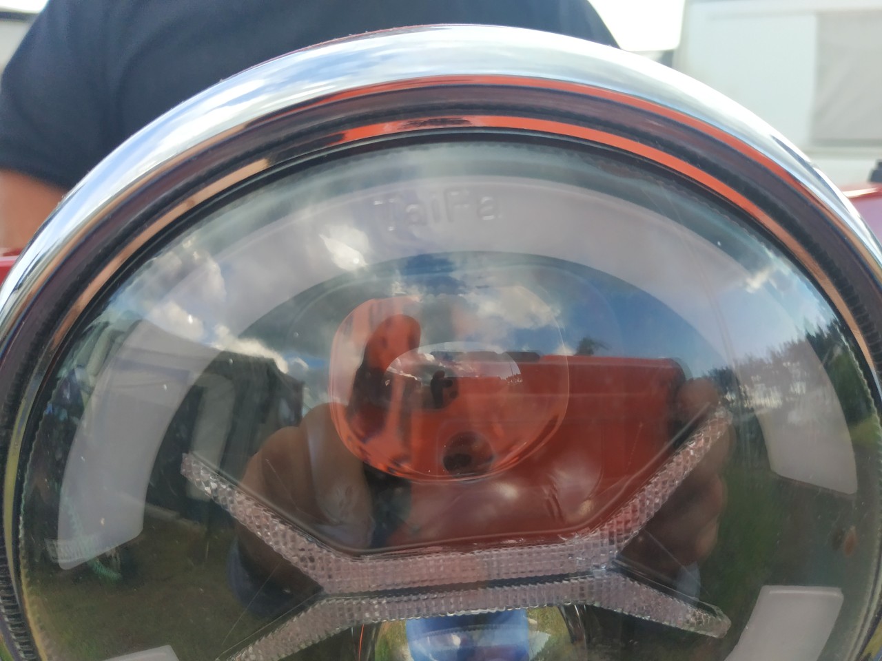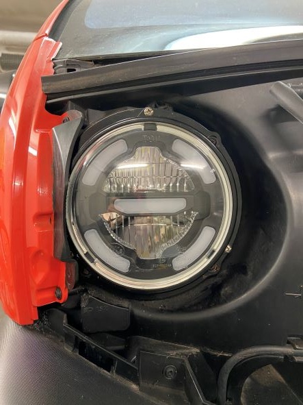 Die drei Schrauben welche die originalen Scheinwerfereinsätze halten halten auch LED Einsätze. Per angepasstem Metallring. ( siehe pre Post )