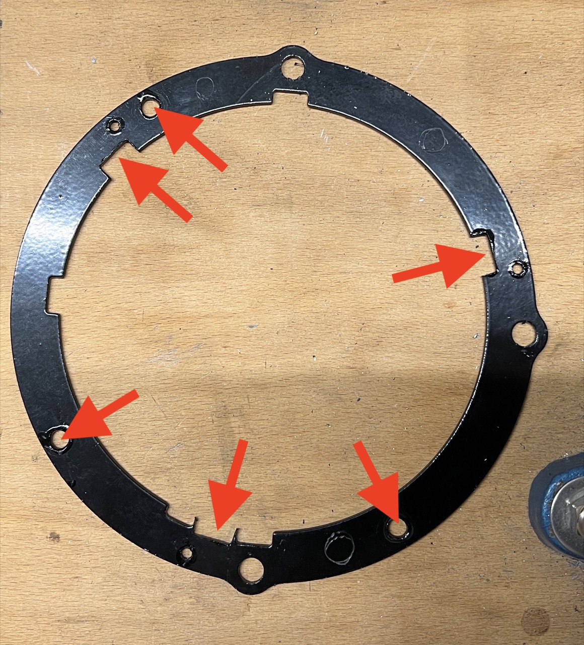 Von denen habe ich aber nur den oberen Teil (welcher den Scheinwerfer hält) verwendet und mit dem originalen Plastikring vom Twizy kombiniert. Bei der Halterung wurden dann 2 Einkerbungen vergrößert, eine Einkerbung neu erstellt und 3 Löcher gebohrt, mit welchem der Ring mit den originalen Schrauben am originalen Plastikhalter des Twizy befestigt wird: