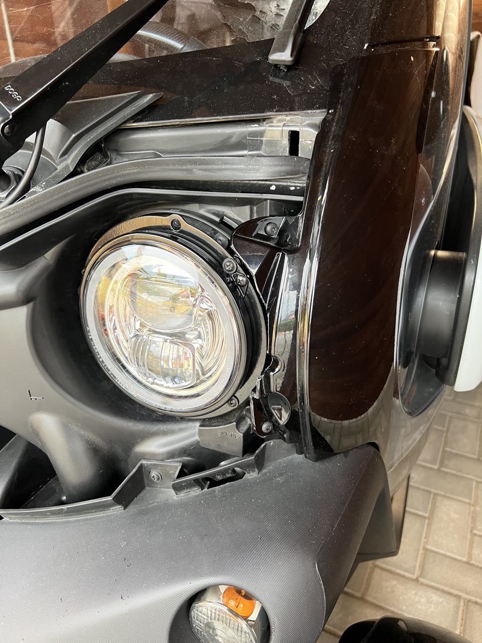 Da die Scheinwerfer größer als die originalen sind, musste auch das lackierte Plastikteil rechts ausgeschnitten werden: