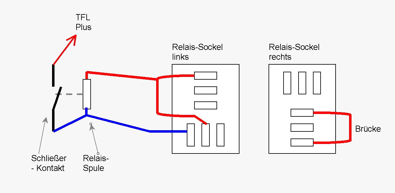 * Im linken Sockel (Standlicht) braucht es eine Brücke vom obersten und unten Mitte und zum Relais an einen Spulen-Anschluß.