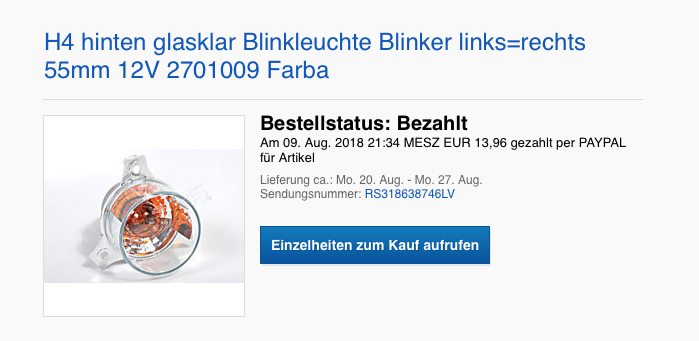 Meine kam ruckzuck aus Litauen - allerdings dauert es etwas länger mit die LED Birnen aus China.brunbjoern schrieb: Seid froh, dass ihr überhaut was bekommen habt, laut Sendungsstatus lagern meine Blinker in einer zentralen Postverteilstelle - seit einer Woche.