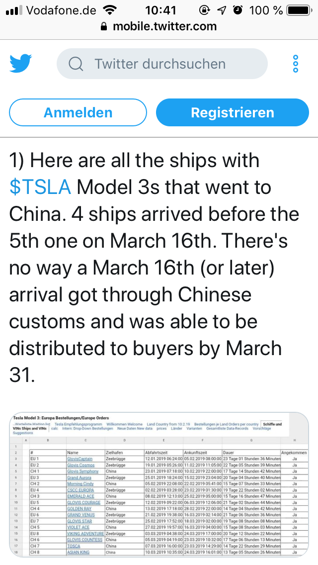 Mehr 2) If we assume there were 1500 $TSLA M3s per ship, it means 6000 could POSSIBLY be delivered in Q1. If then assume 85% of those ARE delivered, it means Q1 China Model 3 deliveries were around 5100, with around 7000 more for Q2.'