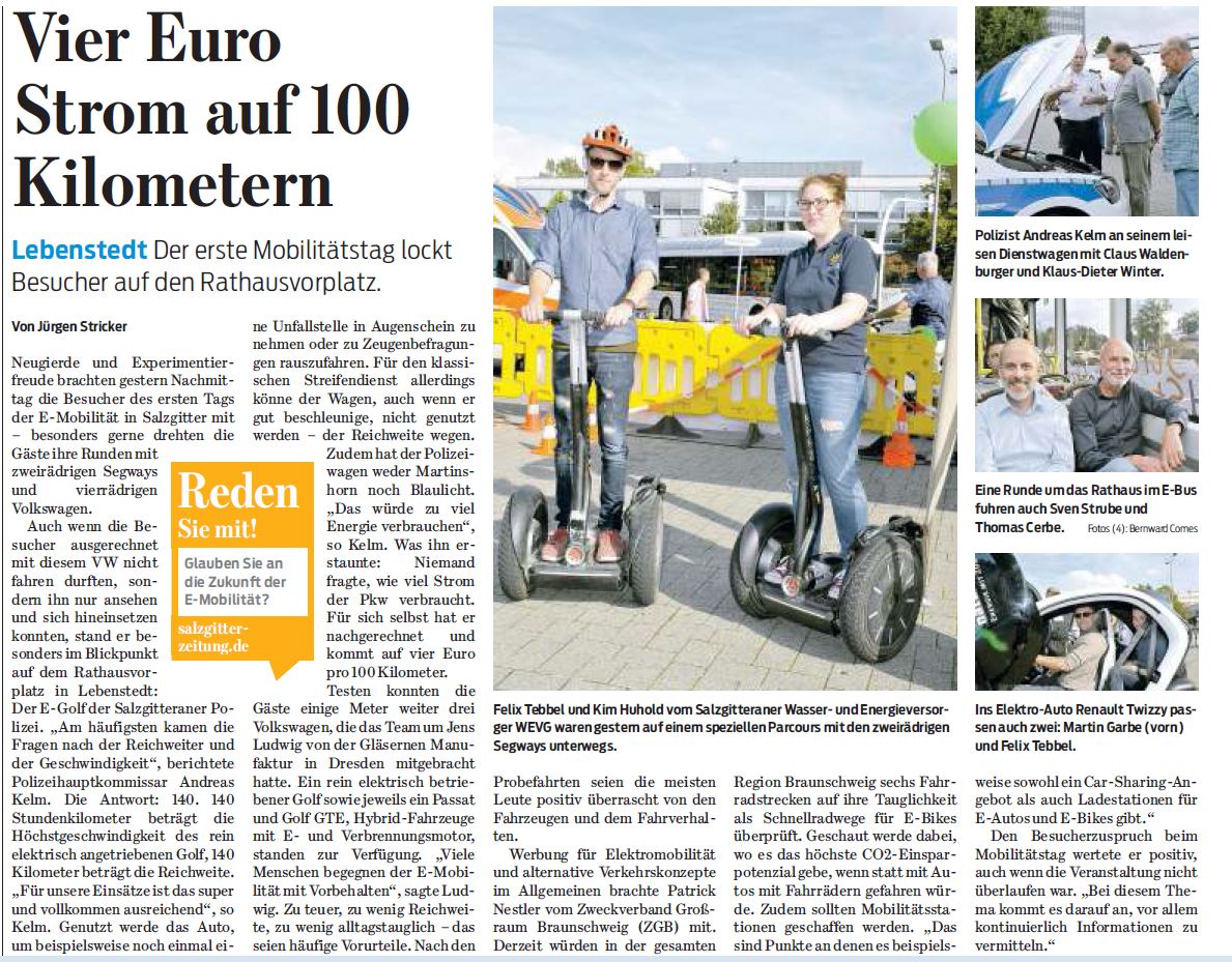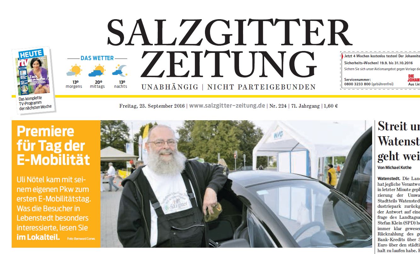 Viele Firmen haben für den 1. Elektromobilitätstag einen guten Einsatz gezeigt. Renault war leider nicht dabei. Aber das hält die Twizyianer ja nicht auf. Die Besucher und die Presse war jedenfalls sehr angetan. Seite 1 der Regionalzeitung: