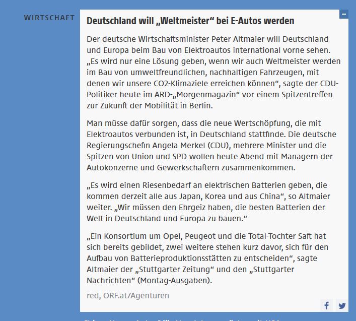 Wir hatten beim Stammtisch vor einiger Zeit einen BASFler aus der Grundchemiesparte für Akkutechnik zu Gast. Der war sichtlich amüsiert als die Fragen zu einer deutsche Zellproduktion aufkamen... ausser ein paar hochalimentierte und subventionierte Forschungsprojekte gibts nix, nada. Fertigungsknow-how gibts nicht. Die Maschinen dafür werden eventuell ja noch in D gebaut oder geplant, aber umsetzen?