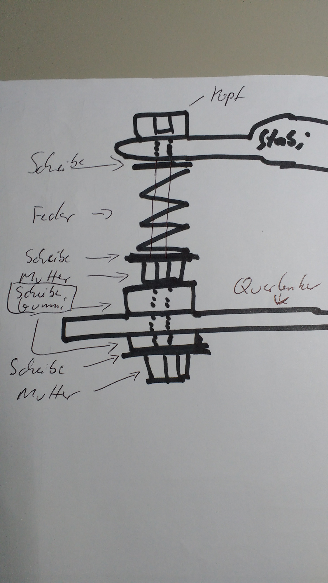 Schaftschraube in passender Länge, Von oben ( Kopf ) seite her Stabiende, U-Scheibe, Feder, U-Scheibe, Mutter, U-Scheibe, (ein kurzer Teil der )Originalteile der oberen Gummiführung im Querlenker, Querlenker, unterer Originalteil der Gummilagerung, U-Scheibe, Mutter.