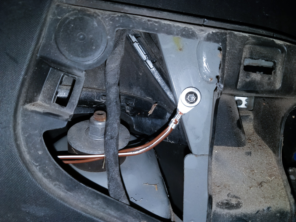 Die Masse habe ich links hinten angeschraubt, da wo die Aufrollautomatik vom Gurt ist.