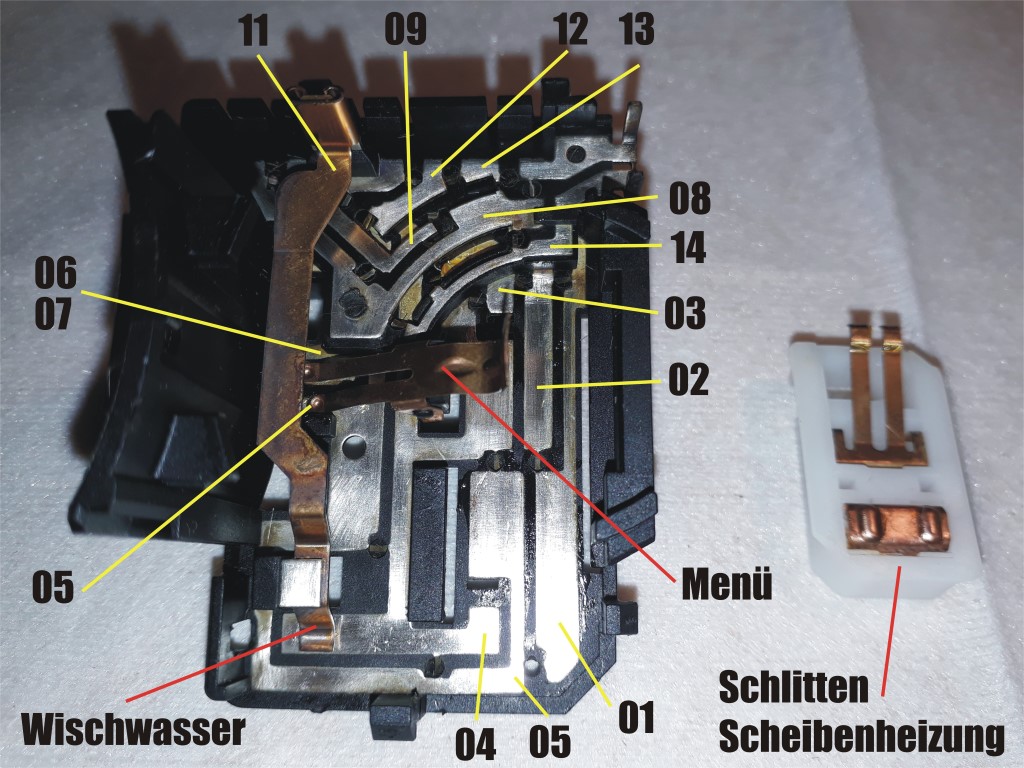 Dann habe ich mir den Schalter vorgeknöpft und geöffnet. Wie ich schon vermutet hatte, waren sämtliche Leiterbahnen korridiert, naja nach 6 Jahren dürfen sie das ja vlt. auch. Bevor ich diese jedoch gereinigt habe, habe ich gemessen. Und siehe da, die Kontakte für die Tastfunktion der Scheibenheizung waren hochohmig - das konnte also gar nicht mehr funktionieren. Weil ich den Schalter sowieso auf hatte, habe ich sämliche Kontaktbahnen gereinigt - auch jene für die Menü-Funktion sowie für die Wischwasser-Funktion. D.h. auch die Wippen habe ich demontiert, um an die Kontakte ran zu kommen. Bei der Gelegenheit habe ich sämtliche Kontakte nach außen (zum Steckeranschluß) gemessen und dokumentiert, damit ich später messen kann, ob sämtliche Funktionen wieder gegeben sind bei geschlossenen Schalter, um mir eine nochmalige Demontage zu ersparen.