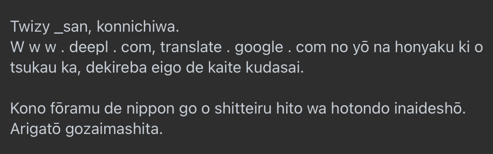Https://www.deepl.com、https://translate.google.comのような翻訳機を使うか、できれば英語で書いてください。
