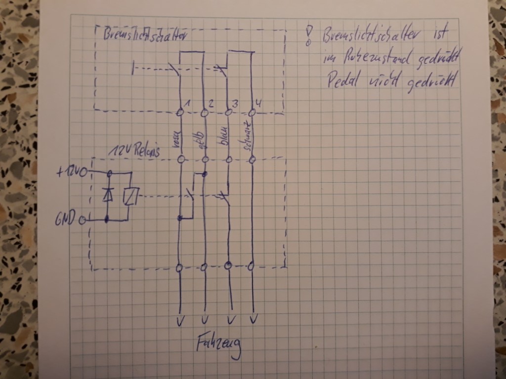 Bei der Messung des Bremslichtschalters und Umsetzung der Schaltung hatte ich leider nicht bedacht, dass der Bremslichtschalter im eingebauten Zustand bei nicht betätigten Pedal gedrückt ist. Anders gesagt, wenn das Bremslicht angeht, dann ist der Schalter entspannt. Von daher musste ich alles noch mal machen. War aber auch nicht so schlimm.