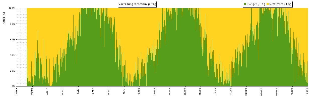 Der grüne Anteil des Balkens zeigt den Eigenbedarf, der gelbe Anteil ist die Einspeisung ins Netz. Trifft die blaue Kurve nun den grünen Bereich, bin ich quasi autark, habe also soviel Strom produziert und Nachts im Akku vorrätig gehalten, wie ich benötigt habe. Ist die blaue Kurve innerhalb des gelben Balkens könnte ich mit einem größeren Akku wahrscheinlich die Monate April, Mai und September noch abdecken. Mehr ist mit meiner PV-Anlage (8,25kWh) nicht möglich!