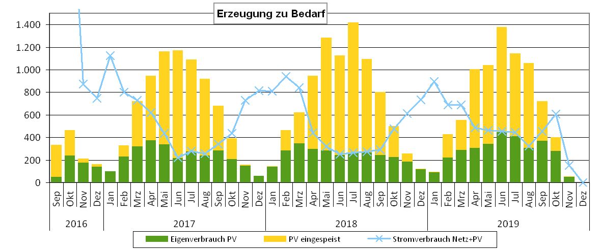 Die blaue Kurve zeigt den Strombedarf (Summe Netz und PV) je Monat an. Die Länge des Balkens ist die produzierte PV-Leistung.