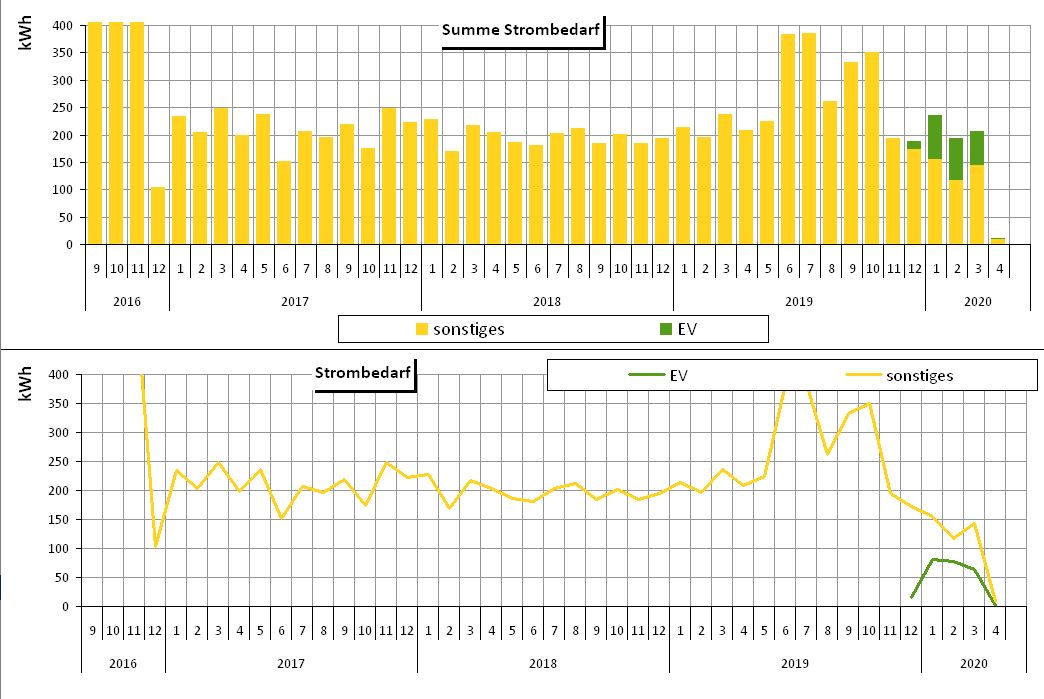 Reduziere ich das Diagramm auf grün und gelb habe ich den Verbrauch für Haus und E-Autos. Deutlich zu sehen ist der Zuwachs durch den Tesla ab 06-2020.