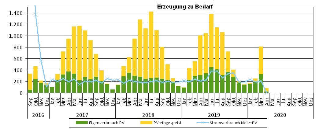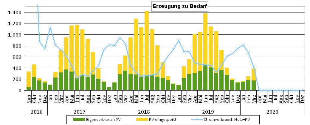 Das folgende Diagramm zeigt das ganz gut. Die Gesamthöhe der Balken ist die von der PV-Anlage produzierte Energie. Der grüne Anteil ist der Eigenbedarf, der gelbe ist die Einspeisung ins Netz. Die blaue Linie ist der Gesamtverbrauch inkl. Netzentnahme. Trifft die blaue Linie die Oberseite des grünen Balkens, sind wir autark. Ist die blaue Linie innerhalb des gelben Balkens, wären wir durch einen größeren Akku öfters autark.