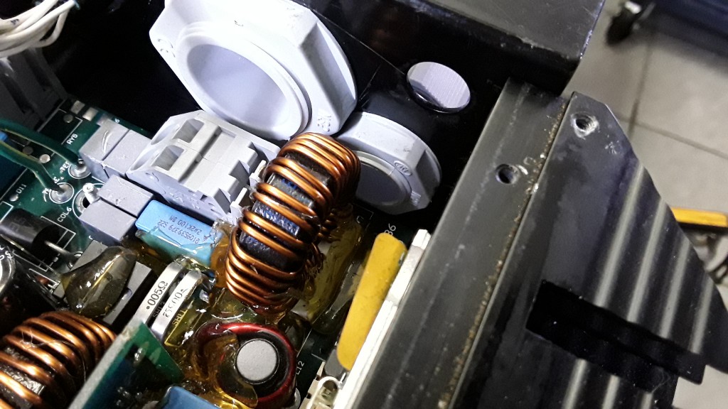 Der ehemalige 12V Klemmblock auf der Platine fällt weg, dann ist auch der 32er Durchlass nicht so stark verbaut.