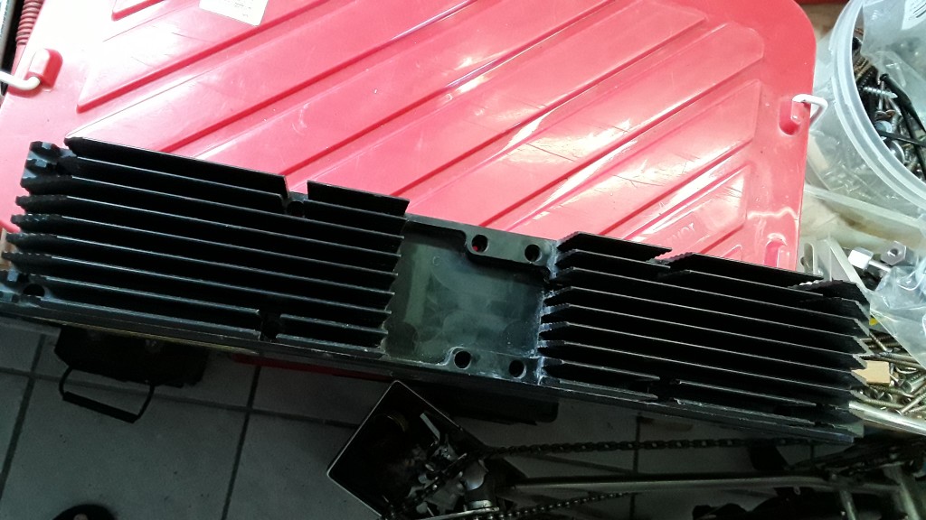 Die Idee mit der Wasserkühlung direkt per Blechmantel über den Kühlrippen scheitert leider an den überstehenden Seitenblechen, das gäbe eine Silikonmurkserei die bestimmt nicht dicht bleibt. Daher fräß ich die inneren Kühlrippen bis runter auf das Niveau unter dem Lüfter ab und schraub auf die Fläche dann einen wasserdurchströmten Alublock. Als Wärmetauscher müsste ein Kühler aus nem kleinen Crosser oder ner LC4 irgendwo vorne neben der Batterie platz finden. Oder ich such mal in den Katakomben nach nem alten VW Boxerölkühler aus Alu... die sind schön kompakt und haben die Anschlüsse nahe beisammen an einem Ende.