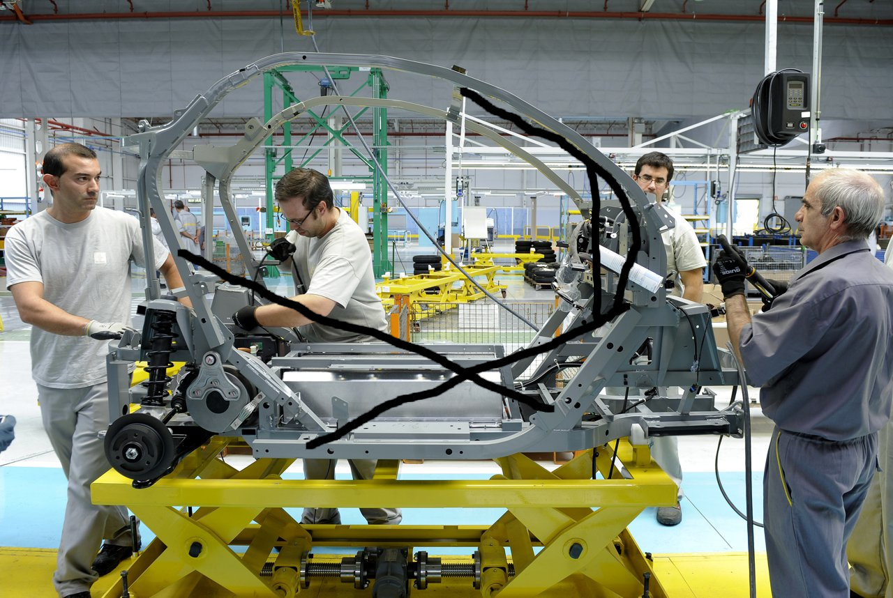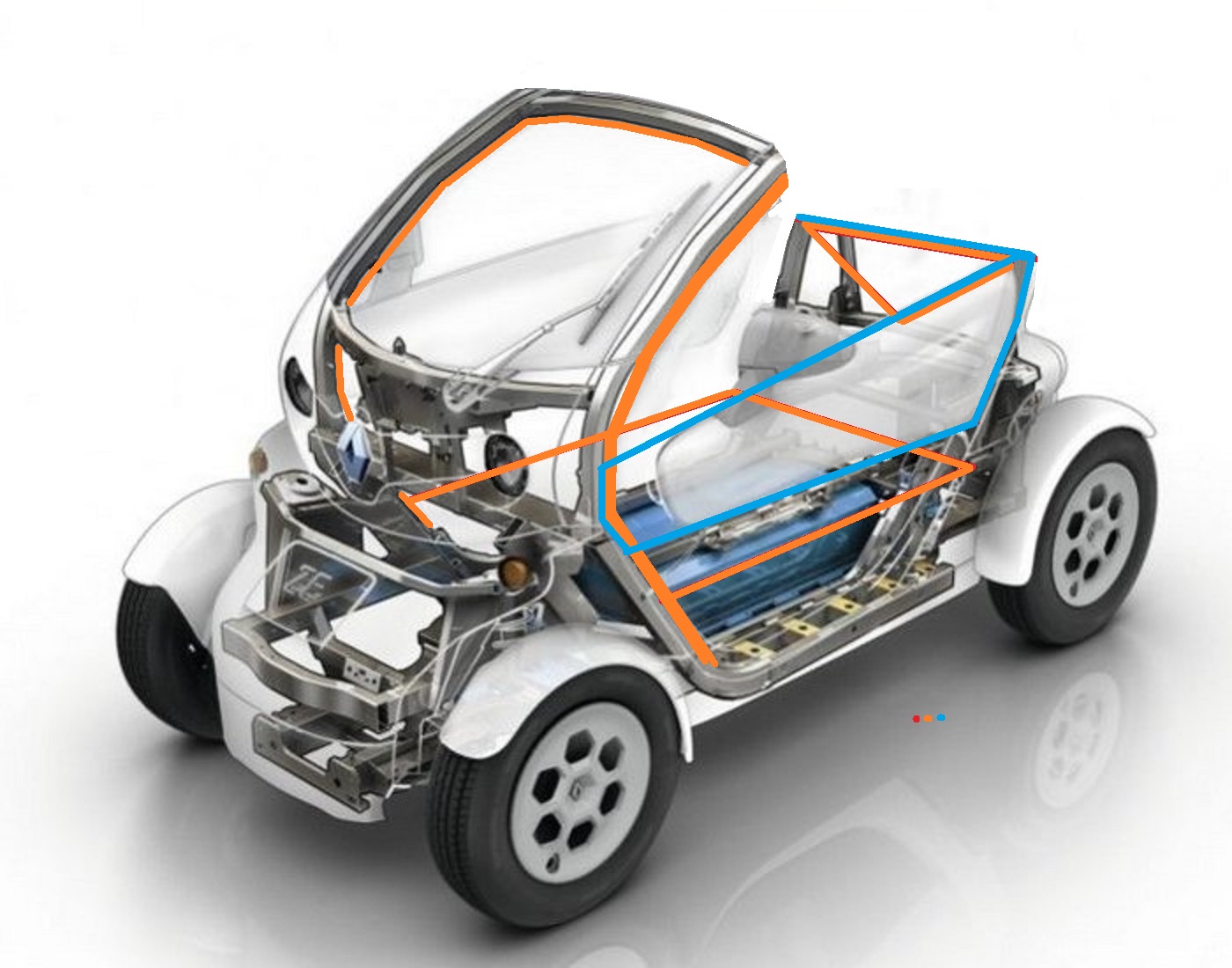 Wenn das Blaue in den Türen sein soll geht das nicht ohne massive Änderung der Türaufnahmen, sonst arbeitet das imho zu stark. Man muss im Einstiegsbereich einen Kompromiss zwischen bestmöglicher Dreiecksausbildung und Nutzbarkeit finden, daher das "gedrückte X" seitlich und die senkrechte Strebe hinter der schrägen A-Säule. Das Ding wird halt auch schnell sackschwer... die Wandstärken sind nicht ohne, zumindest gegen das Blechzeugs des Originalrahmens.