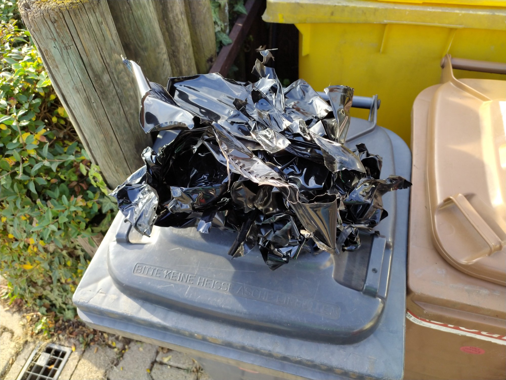 Die zerbrochene Unterschale landete gleich in der Gelben Tonne, die Schienen und Mechanik im Restmüll.