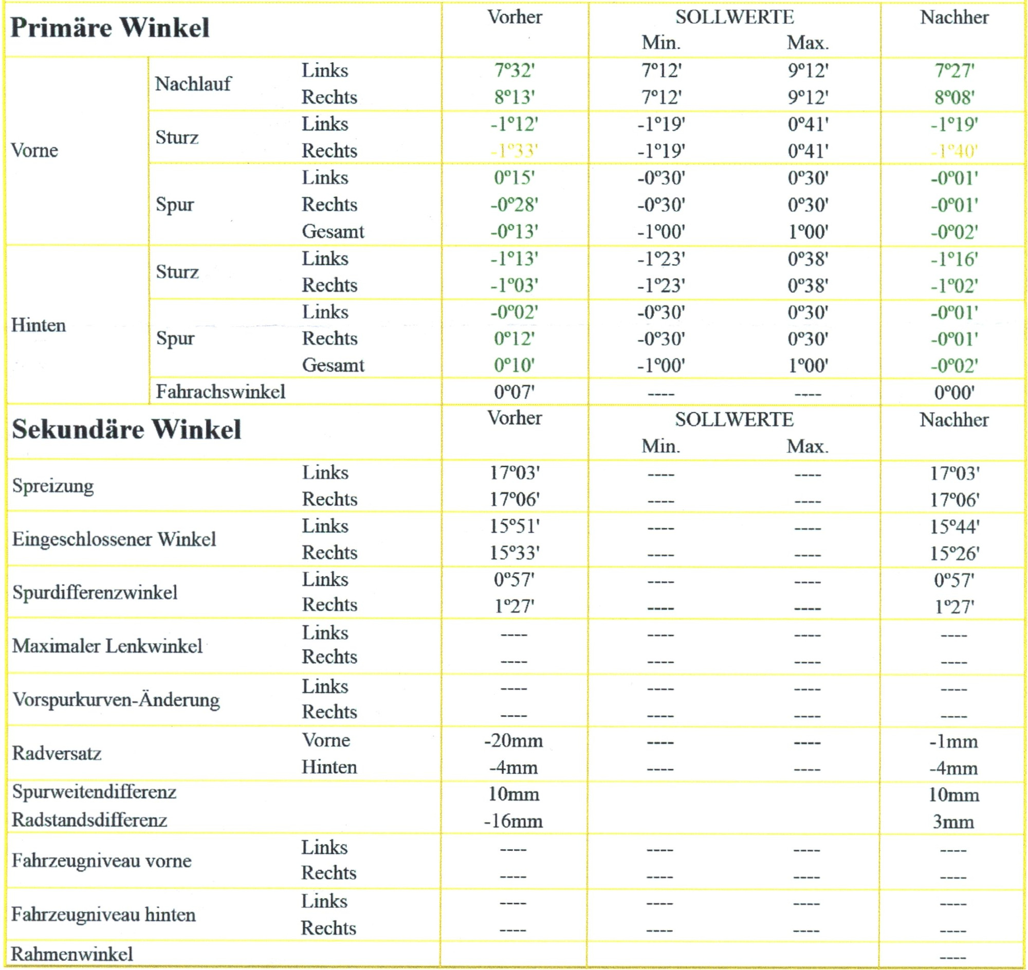 Bei Orginalbereifung sollten nun Vorder- und Hinterräder fluchten, das heißt: