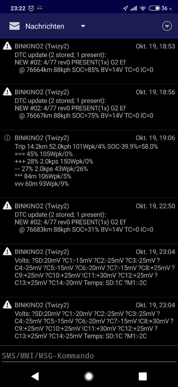 Ladung beendet Meldung um 1:54 UhrCharge Done CHG: 4159 (~4770) Wh Range: 34 - 89km SOC: 100.0% (8.7..100.0%) ODO: 76695.0km CAP: 95.2% 102.8Ah SOH: 79%