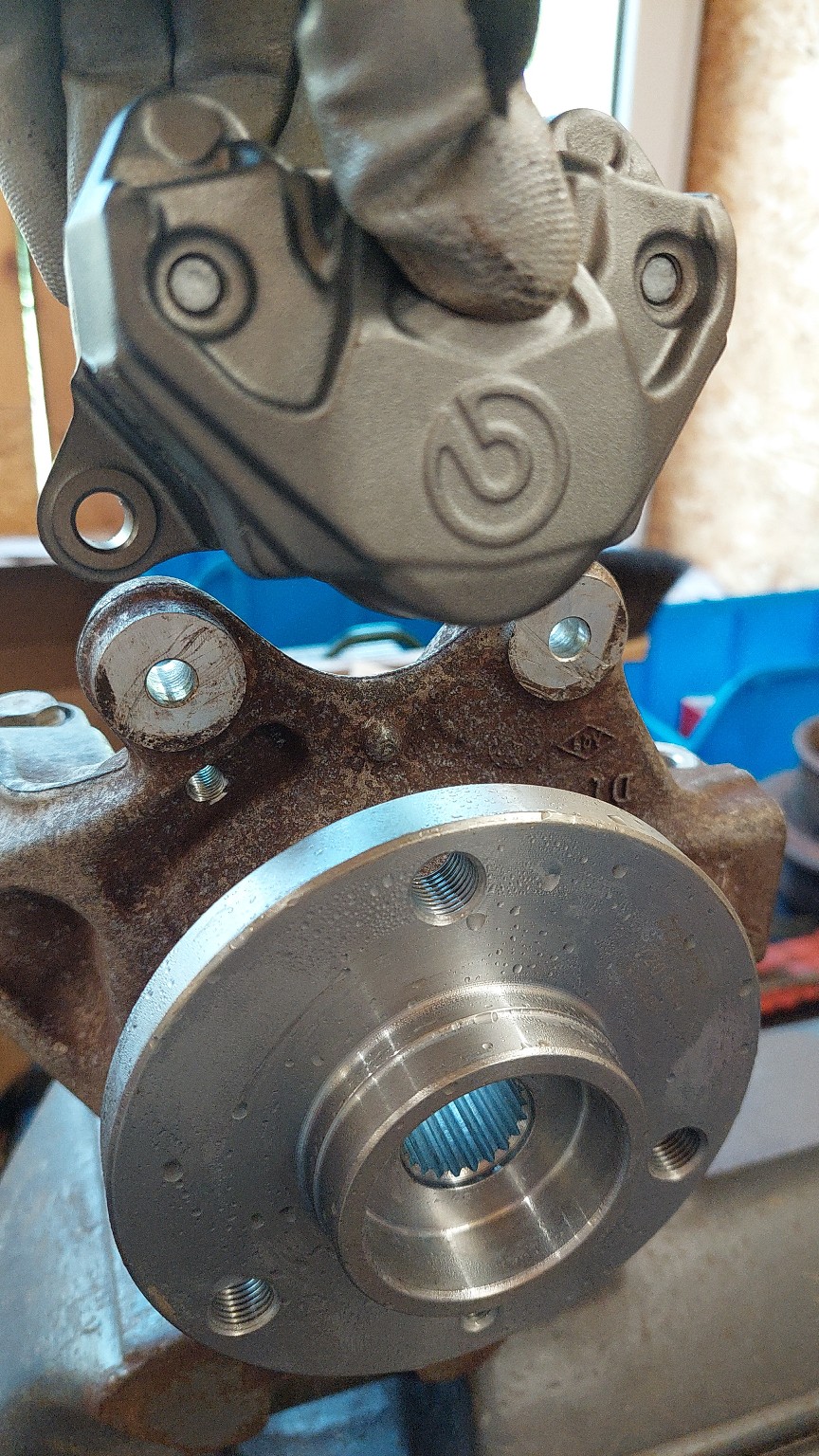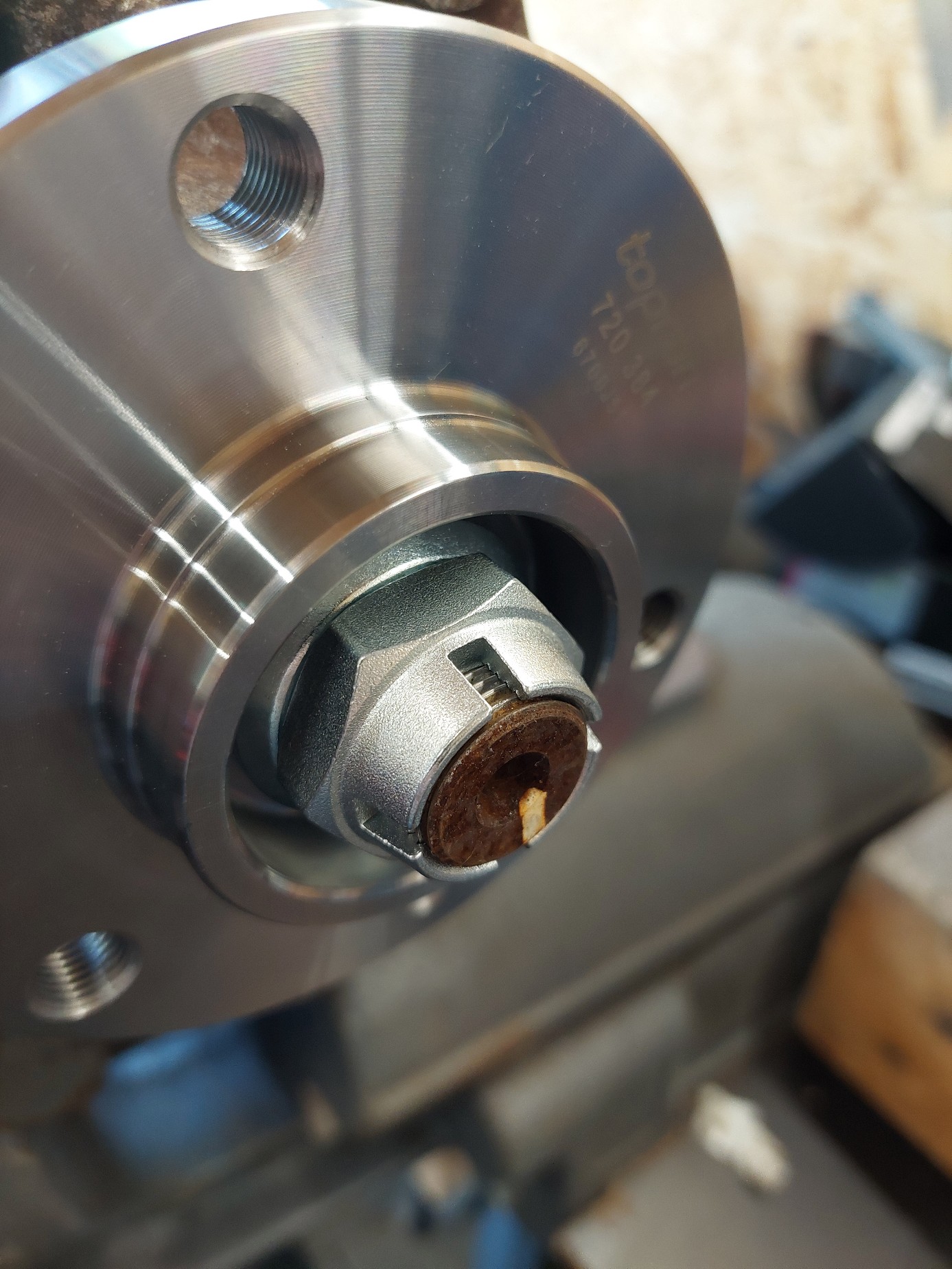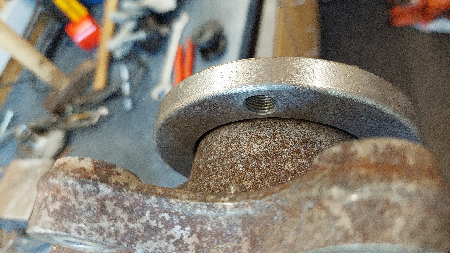 Eigentlich ist deren Innendurchmesser ein paar mm zu klein um über den Nabenteller zu passen.. aber nach Brainstorming mit dem Besitzer des Schrauberparadieses in Lobbach (via Videochat.. man muss ja mit der Zeit gehen..) kam er auf die simple Lösung.. die Scheibe hat eine "Kleeblatt" Innenkontur,