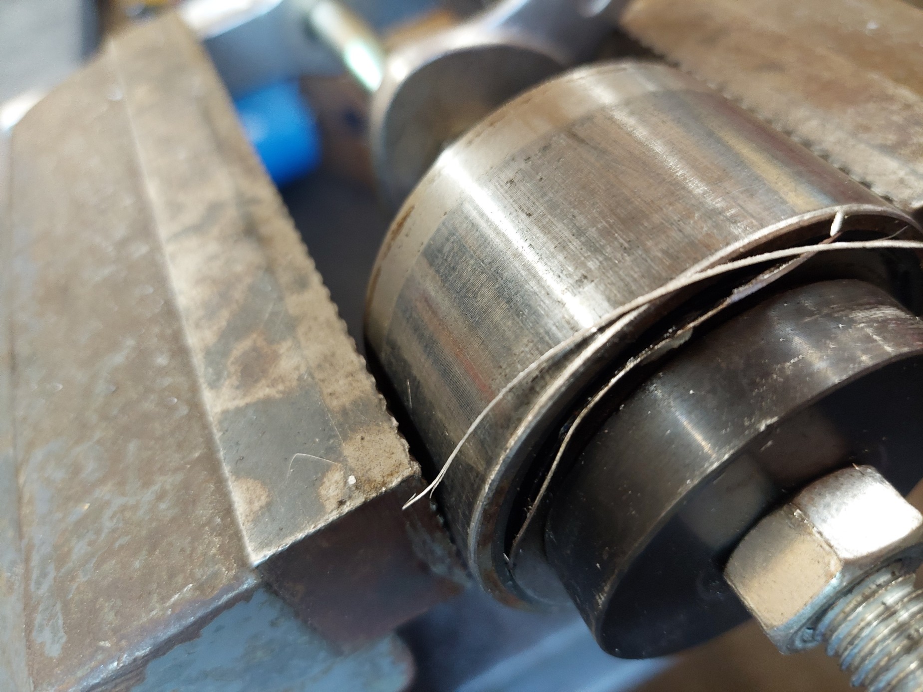 Unschön ist allerdings das.. werksseitig besch.. eingepresst, der Span klemmte unten in der Bohrung, da war wohl was nicht so richtig fluchtend bei der Erstmontage. Das Material stammt vom obersten Rand der Bohrung.
