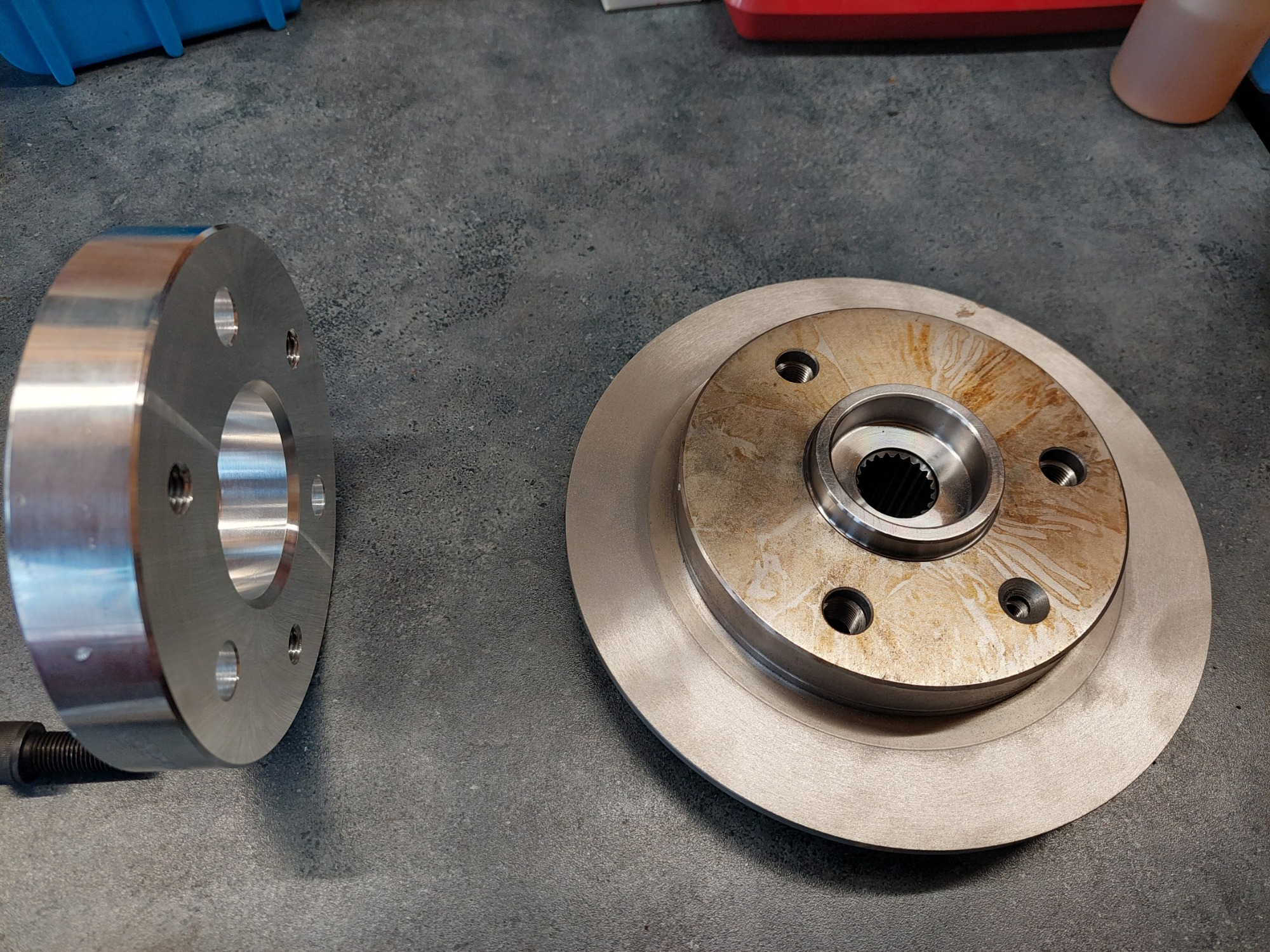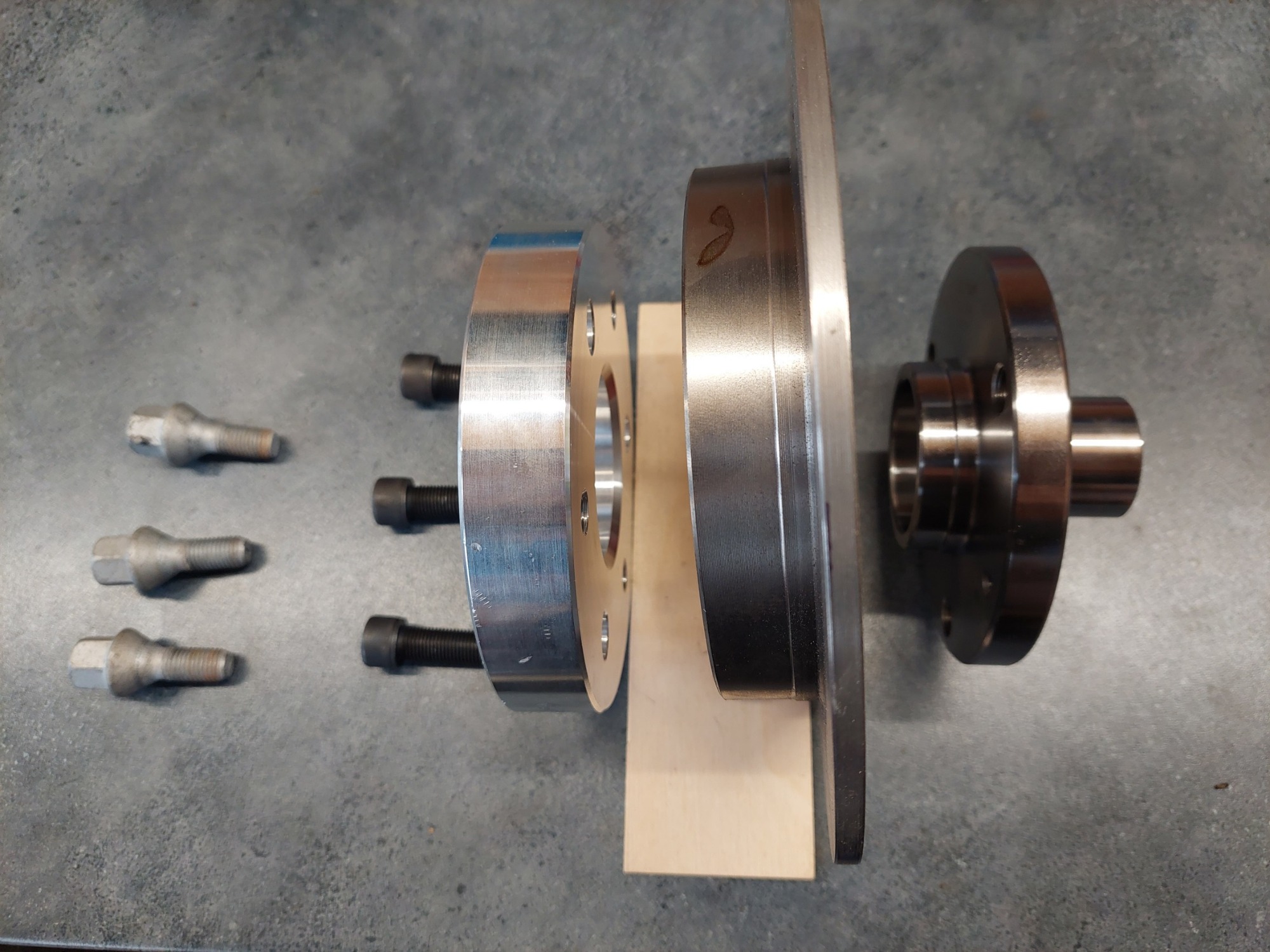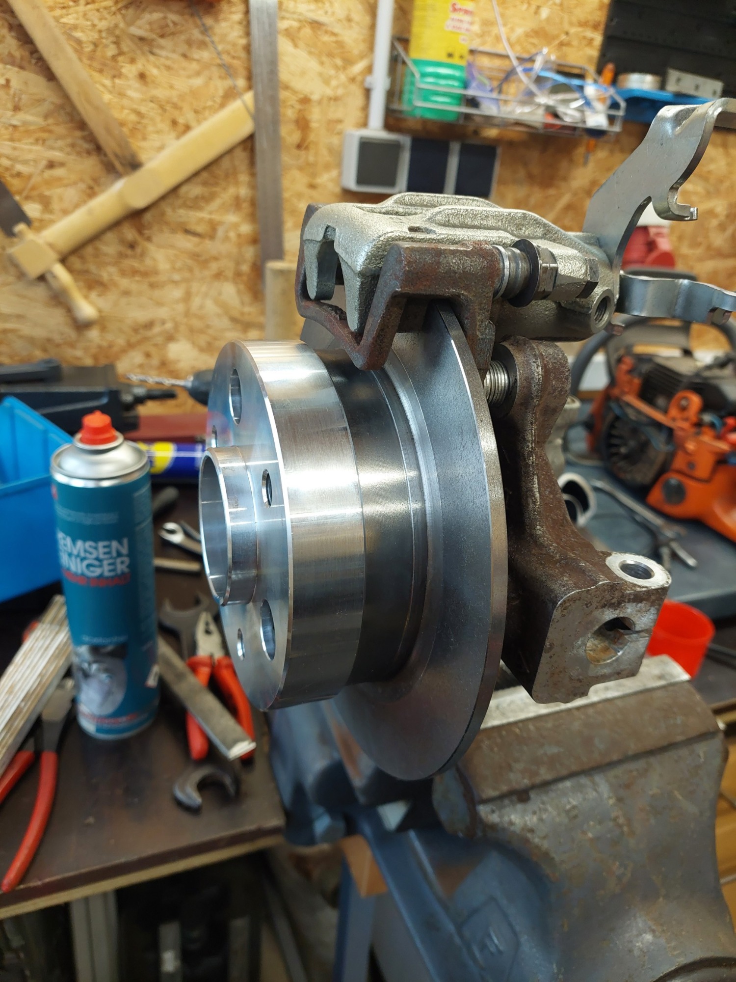 So sieht das dann zusammen montiert aus. Der rechte Teil der Nabe steckt dann im Radlager. Man sieht das die Schraubenlänge der schwarzen Inbus genau passt. Da ist kein Platz mehr dahinter wenn die Nabe im Lager sitzt. Der "Topf" der Bremsscheibe ist nicht tief genug um die Scheibenfläche so weit richtung Radträger zu bringen wie es bei der originalen Scheibe des T ist, die sitzt eben besagte 11mm weiter innen. Daher der Abstandshalter für den Sattelträger.
