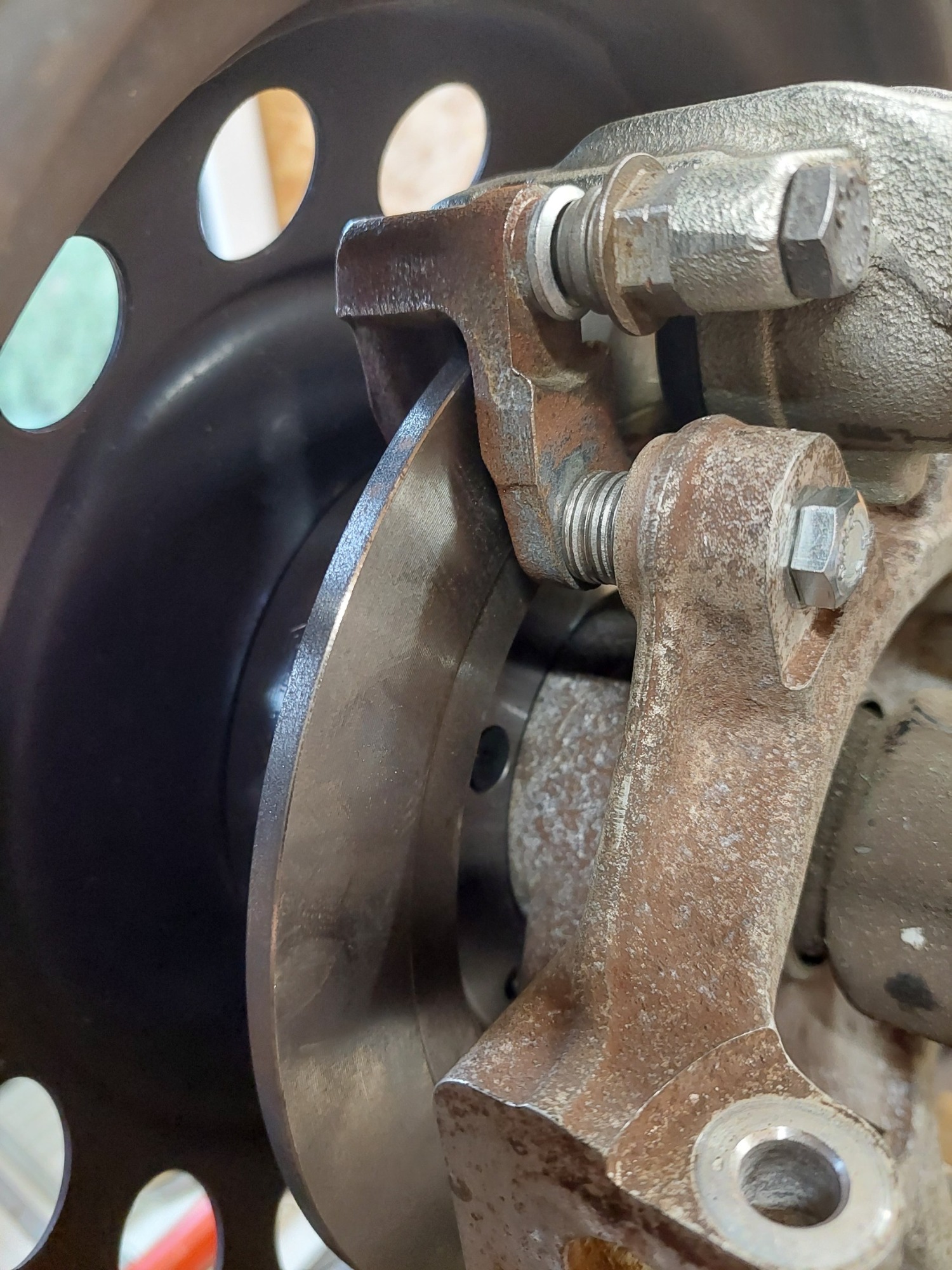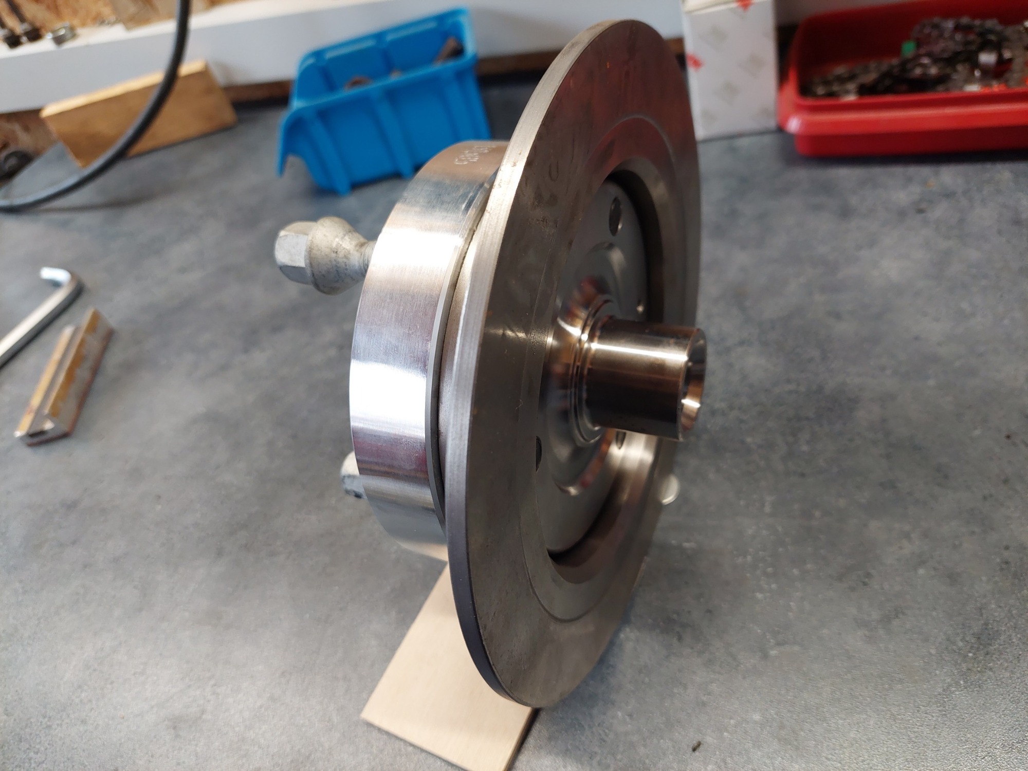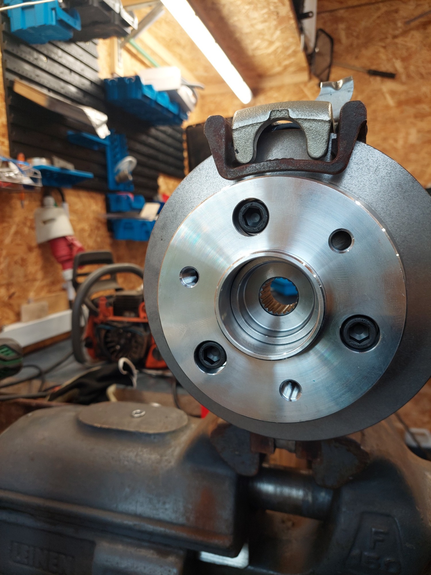 So sieht das dann zusammen montiert aus. Der rechte Teil der Nabe steckt dann im Radlager. Man sieht das die Schraubenlänge der schwarzen Inbus genau passt. Da ist kein Platz mehr dahinter wenn die Nabe im Lager sitzt. Der "Topf" der Bremsscheibe ist nicht tief genug um die Scheibenfläche so weit richtung Radträger zu bringen wie es bei der originalen Scheibe des T ist, die sitzt eben besagte 11mm weiter innen. Daher der Abstandshalter für den Sattelträger.