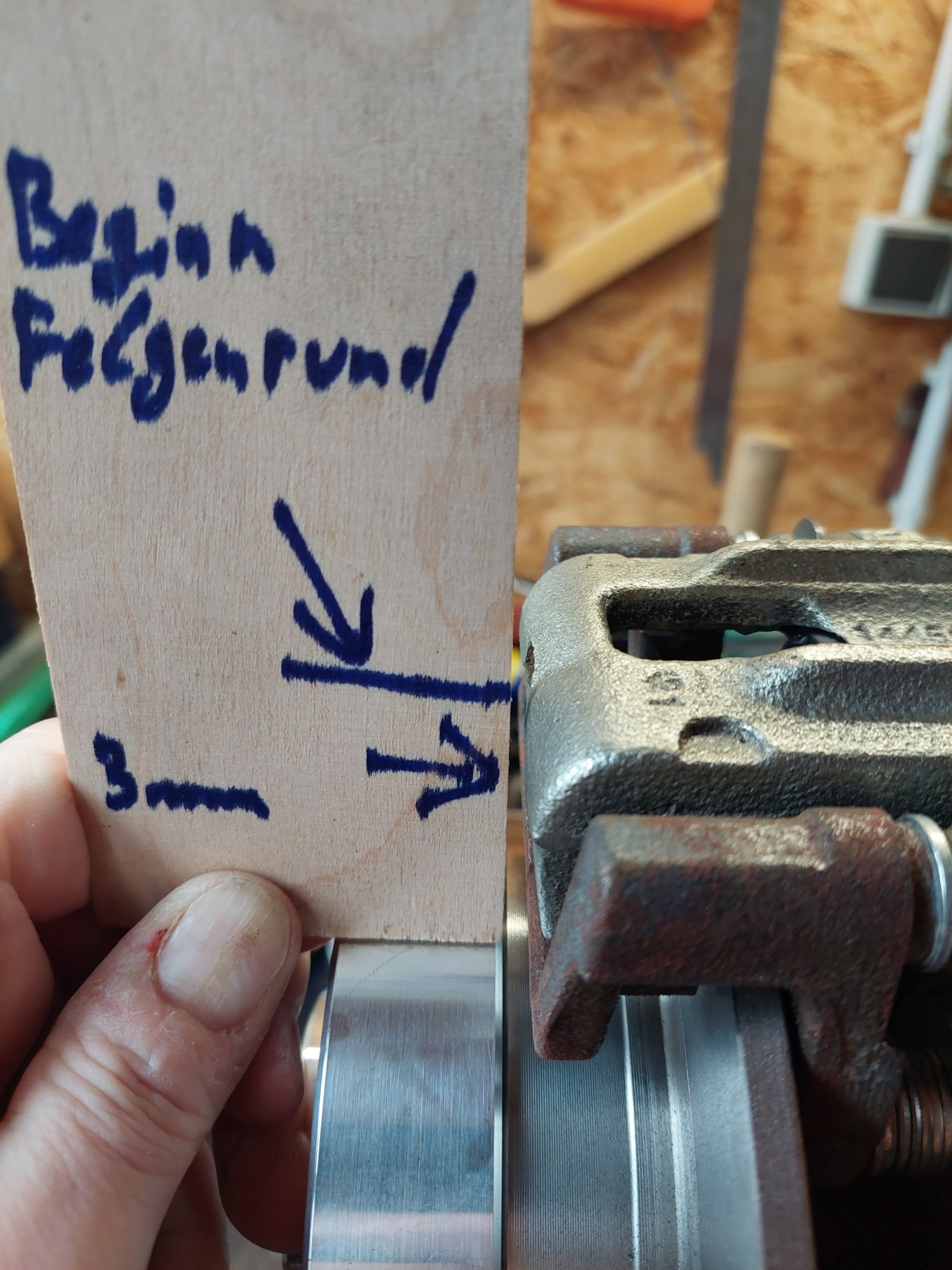 Hier sieht man den Grund für den Adapterring, ohne wäre der Freigang für die Felge am Bremssattel zu gering, und die Krümmung der Felge beginnt in etwa an der bezeichneten Stelle, was zur Kollision mit dem Sattel führen würde. Ausserdem passen die Kotflügel dann nicht mehr...