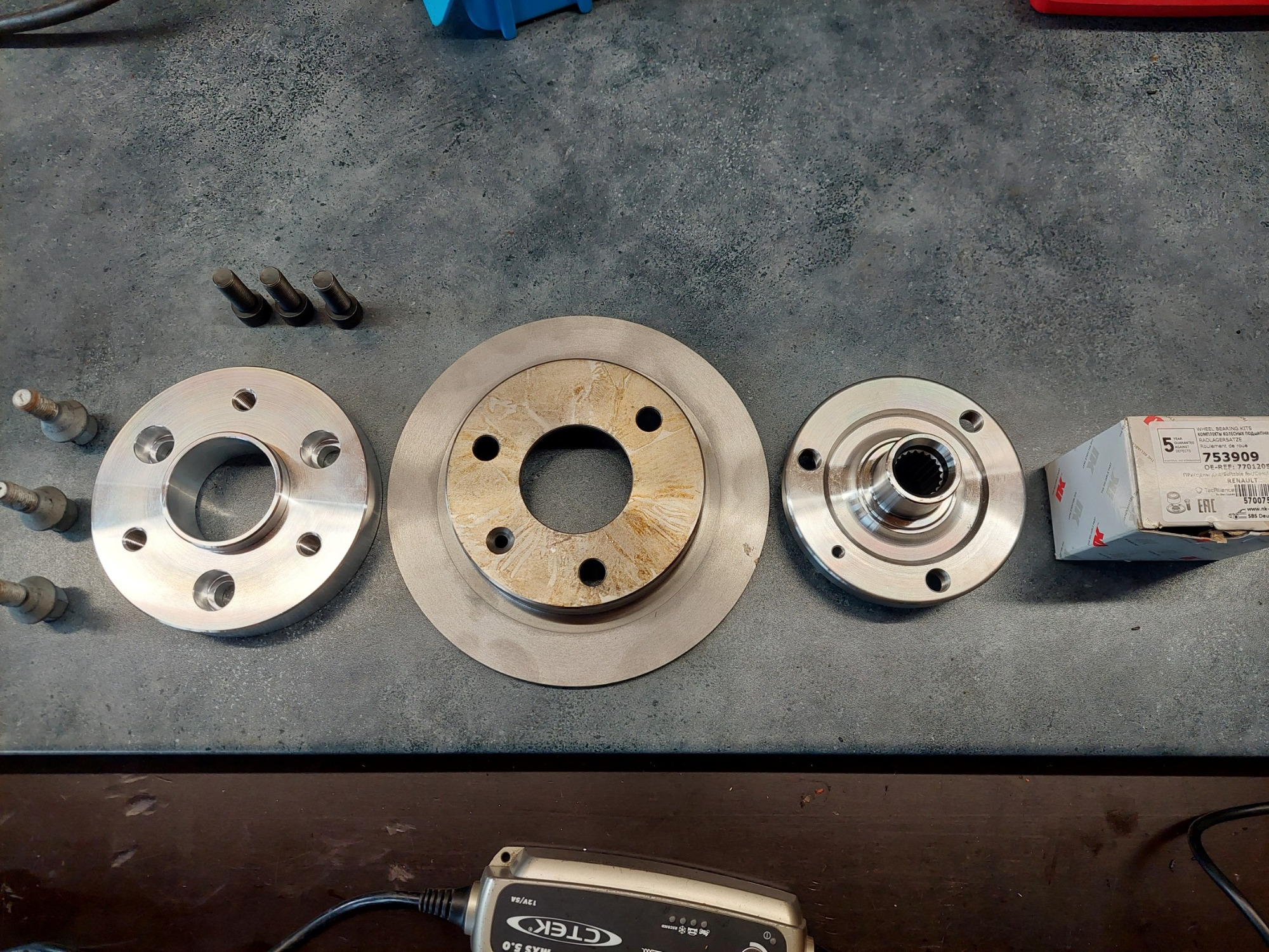 Radlager ( Karton ), Nabe, Bremsscheibe, Adapter. Die schwarzen Inbus sind für die Befestigung des Adapters auf der Nabe, das ist ein anderer Lochkreis und ein anderes Gewinde als das was am T original verbaut ist!