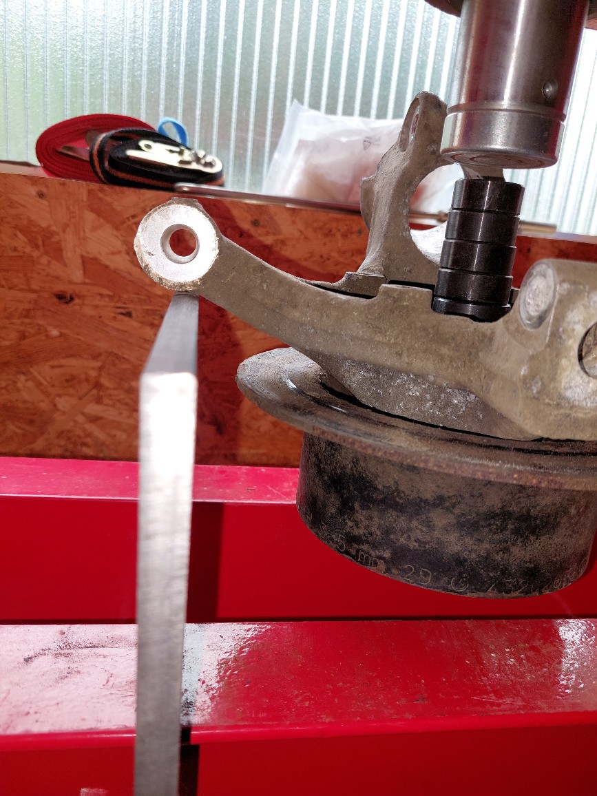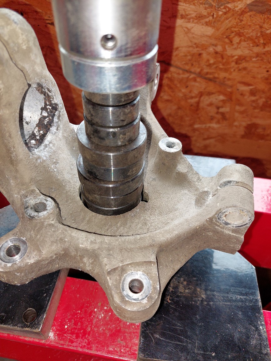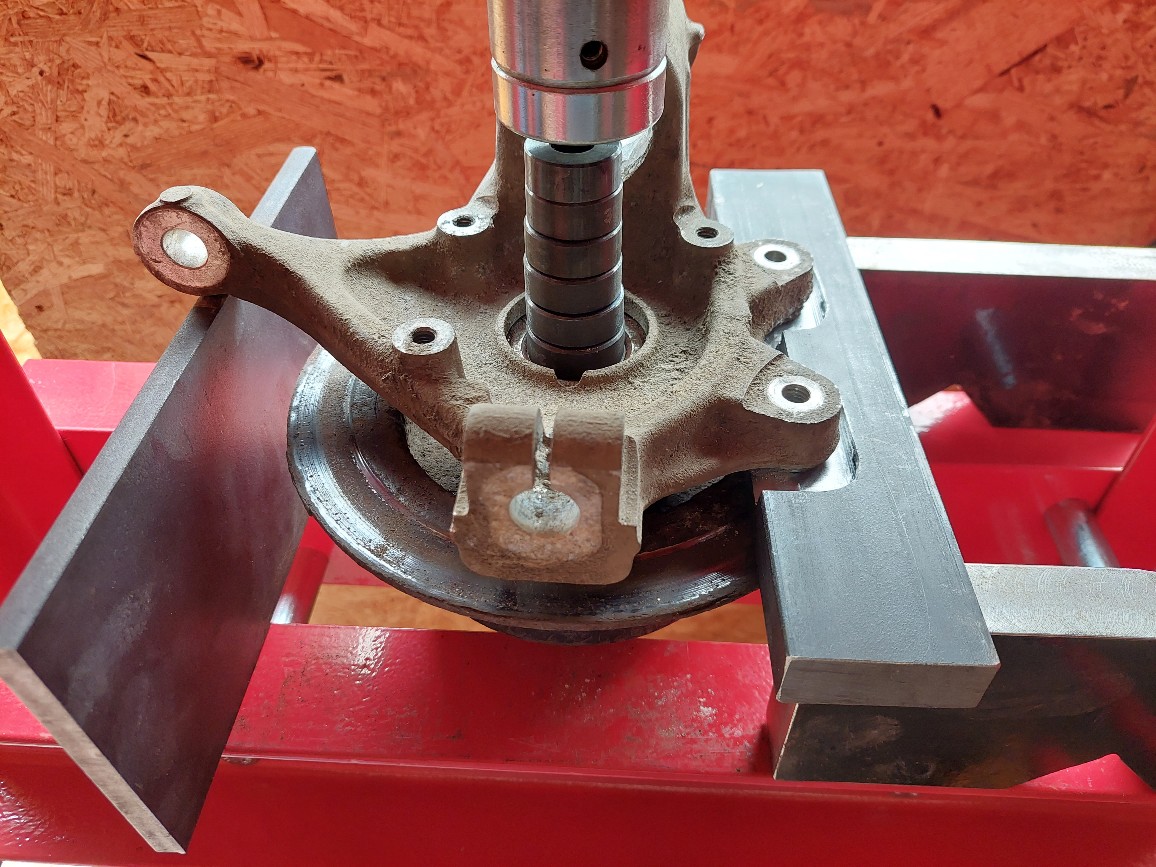 Das ist einfach ein angepasstes Stück Stahl das durch die Fräßungen zwischen Scheibe und Radträger passt. Der Ausdrückvorgang geht damit leichter und schneller als mit zusammengewürfeltem Zeugs. Sieht dann so aus: