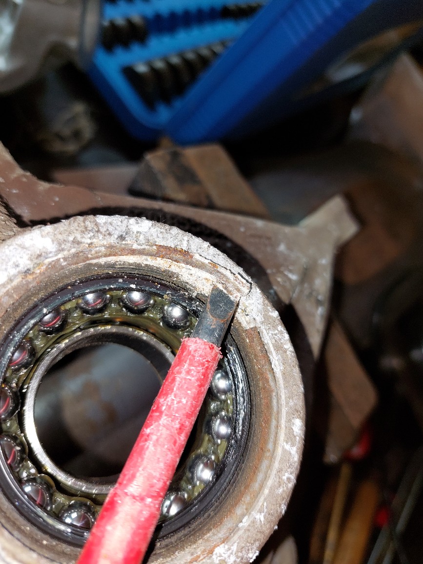 Ein Innenring bleibt drauf, wenn die Scheibe rettbar ist muss der noch abgezogen werden. Ich schleif da einfach mit dem Drehmel eine Nut rein und knack ihn mit nem Meisselschlag. Obacht, das Zeugs splittert!