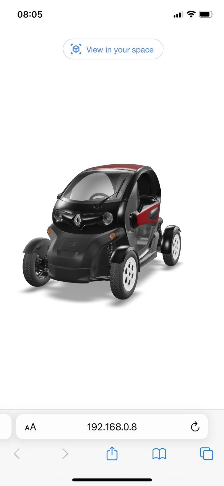Auf einigermaßen modernen Smartphones sollte ein Button erscheinen "View in your space" - mit einem Klick darauf wird das interne Augmented Reality Framework gestartet, ihr seht euer Kamerabild und könnt den Twizy virtuell in eurer Welt platzieren, drehen und euch um das Fahrzeug herumbewegen.