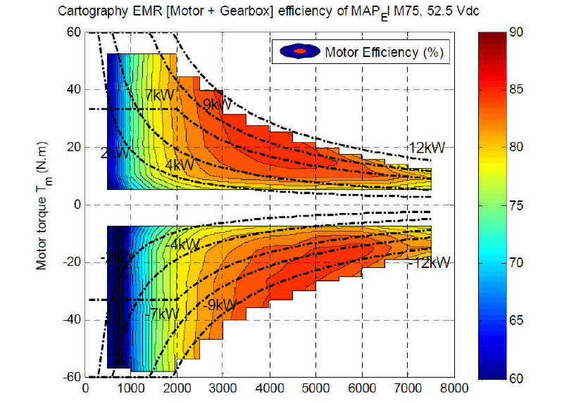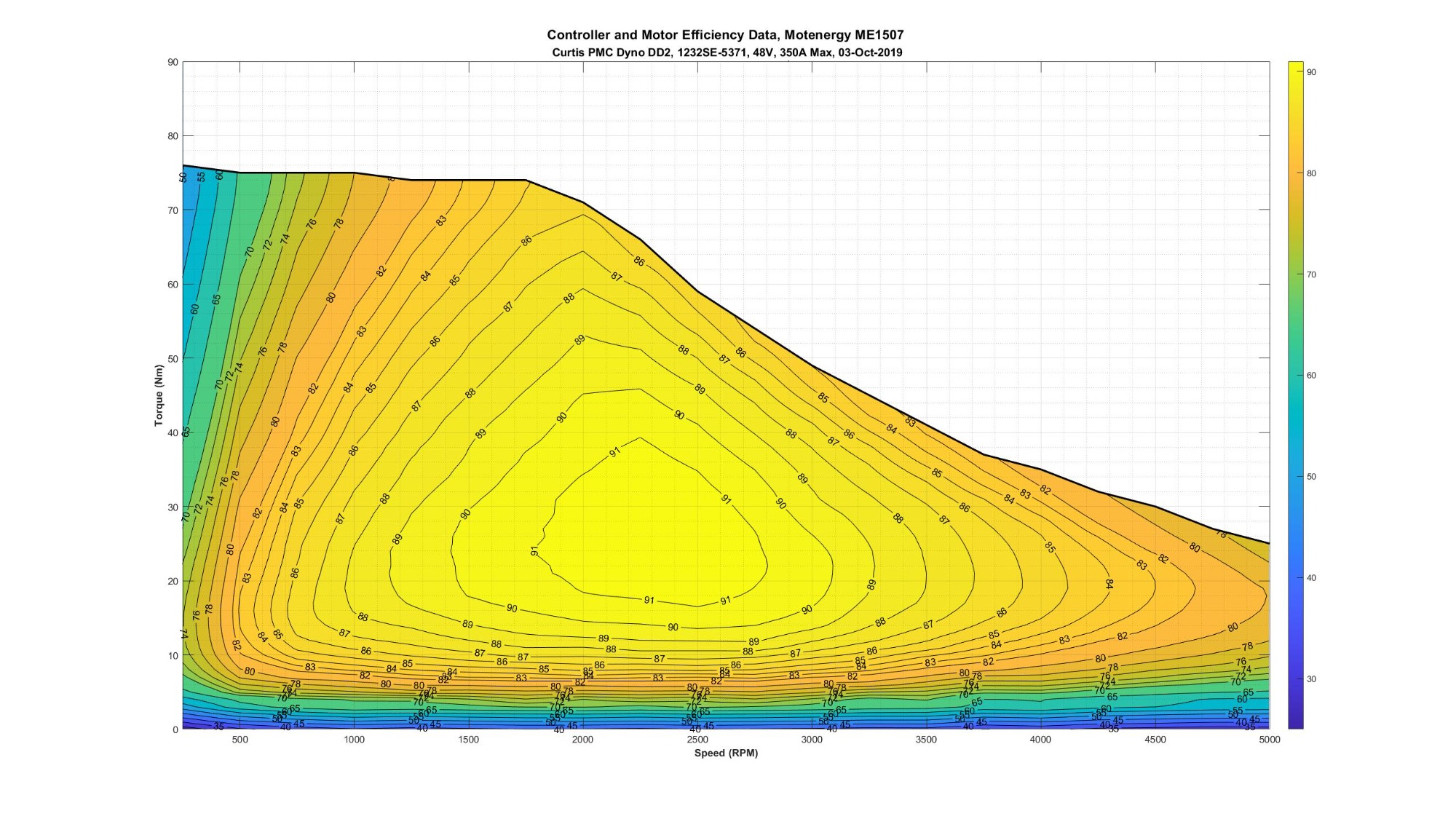Anbei mal zwei Wirkungsgraddiagramme. Einmal ein Curtis mit ME1507 (auf der Basis wird der neue Motor aufbauen), sowie einmal der Mahle AMV7118, welcher original im Twizy verbaut ist. Bei letzterem bitte etwa 5% vom Wirkungsgrad abziehen, weil bei dem ME1507 Graph der Inverter mit eingerechnet ist beim Wirkungsgrad.