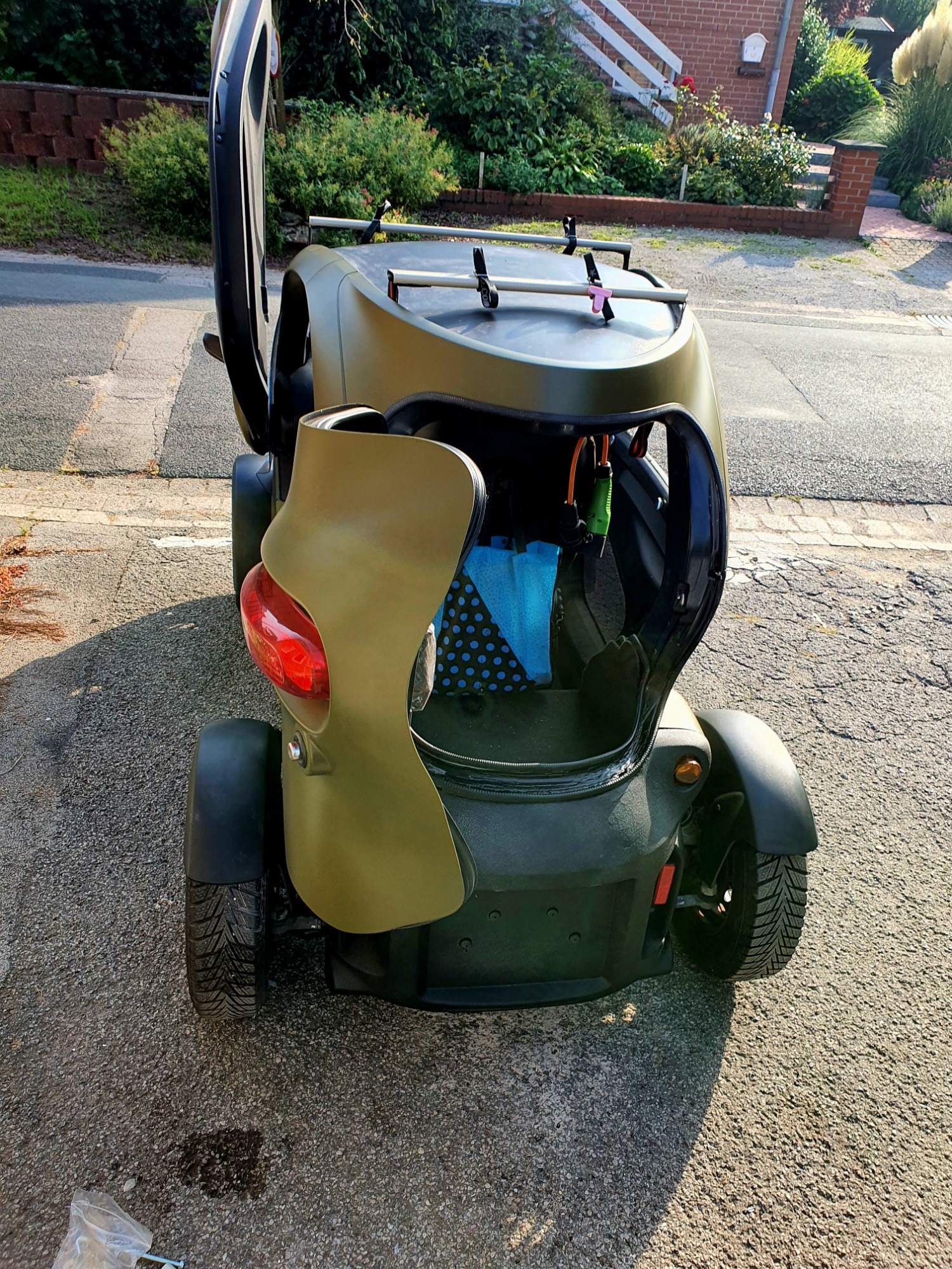 kleine knöpfchen von außen zum türöffnen sprechende Alarmanlage eingebaut dachgepäckträger drauf Eigenbau alles ein bisschen abgedichtet und Zugluft dicht gemacht smart Sitz mit sitzheizung massagefunktion und Belüftung. Einmal komplett von weiß auf olivgrün umlackiert und alle schwarzen kunststoffteile mit einem selbst kreierten Lack richtig grob lackiert so dass das Fahrzeug etwas markanter wirkt. alle Embleme weggemacht und schwarze Scheinwerfer eingebaut sowie diverse 3D druckteile angefertigt die ist zum Runterladen gab bzw eine Datei habe ich selbst gemacht und zwar der Deckel für das wischwasser.....Power Box eingebaut Halterung für lade Adapter am auf der anderen Seite des Sitzes eine Halterung für den Gurt damit man nicht so weit nach hinten greifen muss. Kofferraumausbau mit Alu dibond Platten das ganze von unten isoliert jetzt hört man das Getriebe auch nicht mehr so sehr