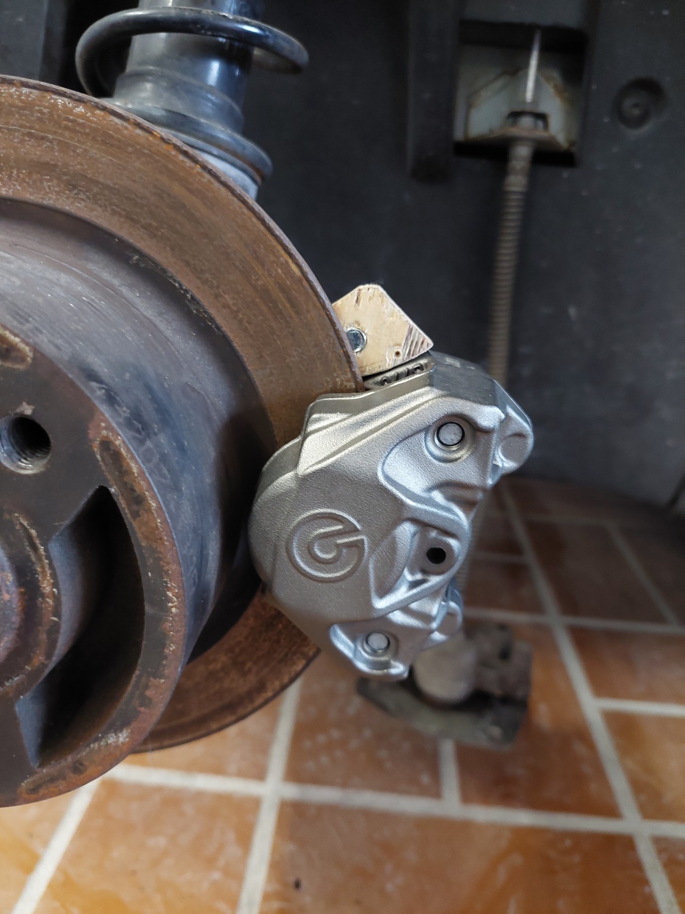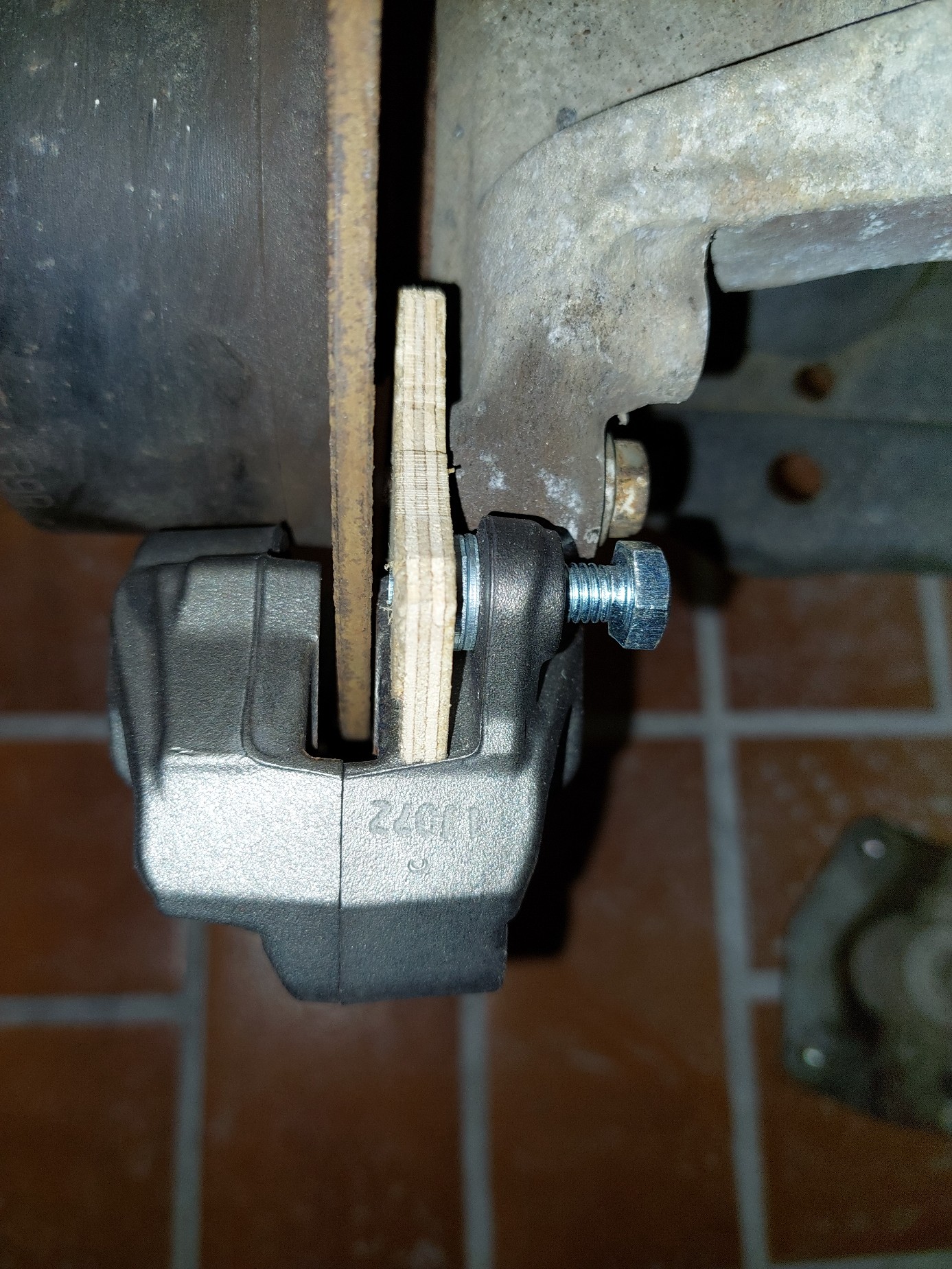 Die Abstände der Befestigungspunkte liegen ungünstig, der Sattel müsste weiter an den Radträger. Da ist dann das obere Befestigungsauge im Weg. Durch das versetzte Anordnen bleiben nur 6mm Luft zwischen Sattel und Felge. Eventuell geht es knapp auf wenn ich das Ganze noch 4-5mm weiter nach unten bekomme... die Schablone aus MDF fräsen muss ich wegen dem Versatz der hier noch mit den Unterlegscheiben improvisiert ist eh.