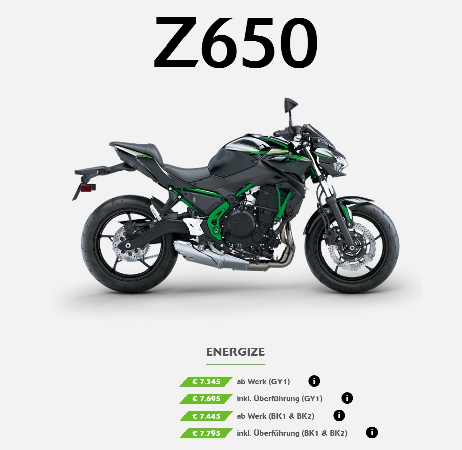 oder man kauft eine Kawasaki Z650 mit ner Vmax von 191 km/h und ABS und hat noch genug Geld übrig für 2.444 L Benzin zu 1,72 €, bzw. rund 55.000