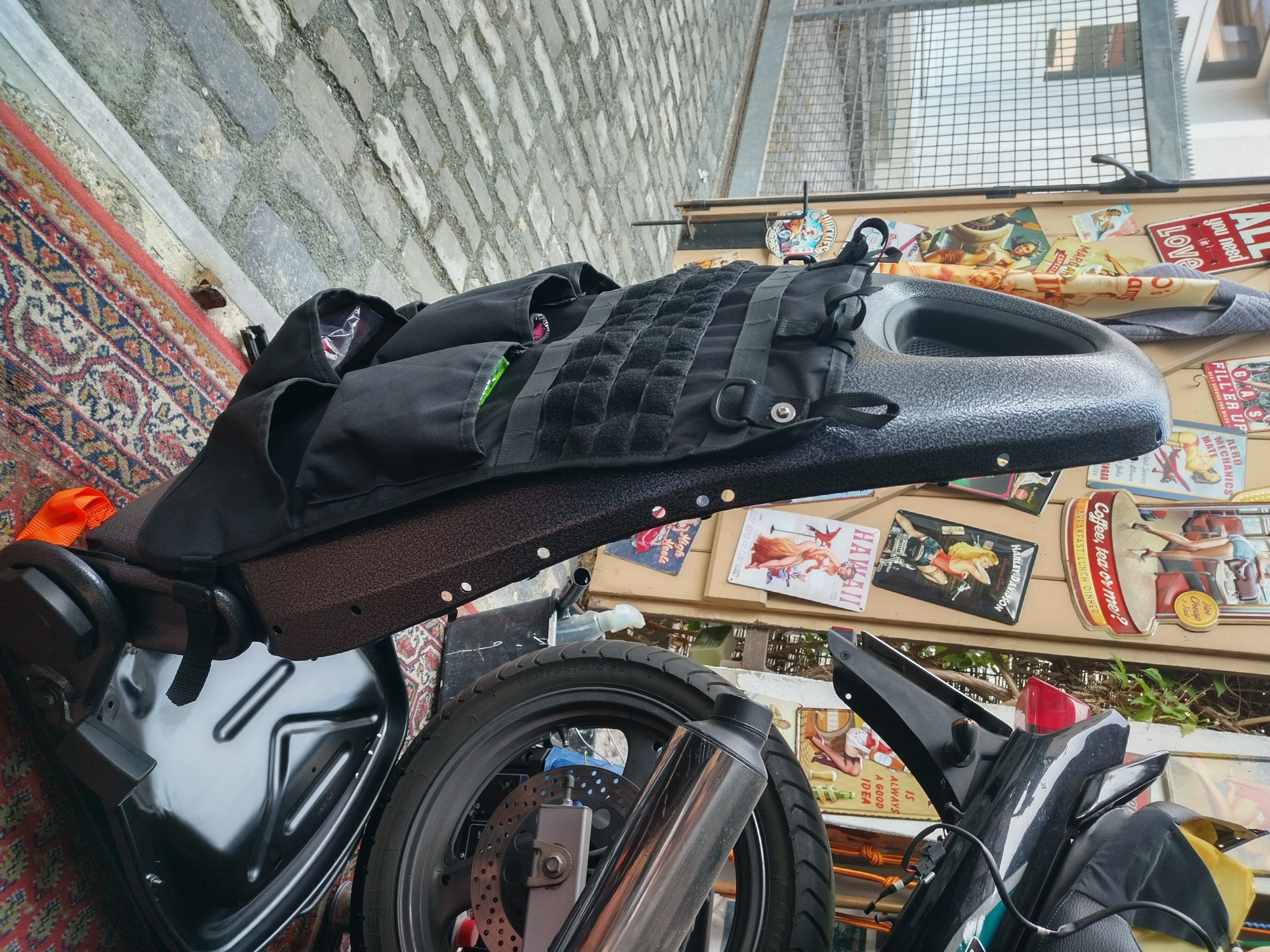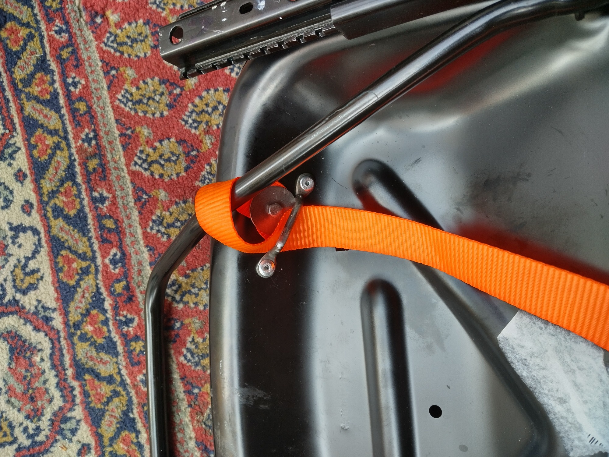 da ich auch ab und zu mal beifahrer sein darf und nicht auf dem sozius vergessen werden möchte, hab ich eine einfache selbstgebaute mechanik mit einem gurtband zum entriegeln montiert.