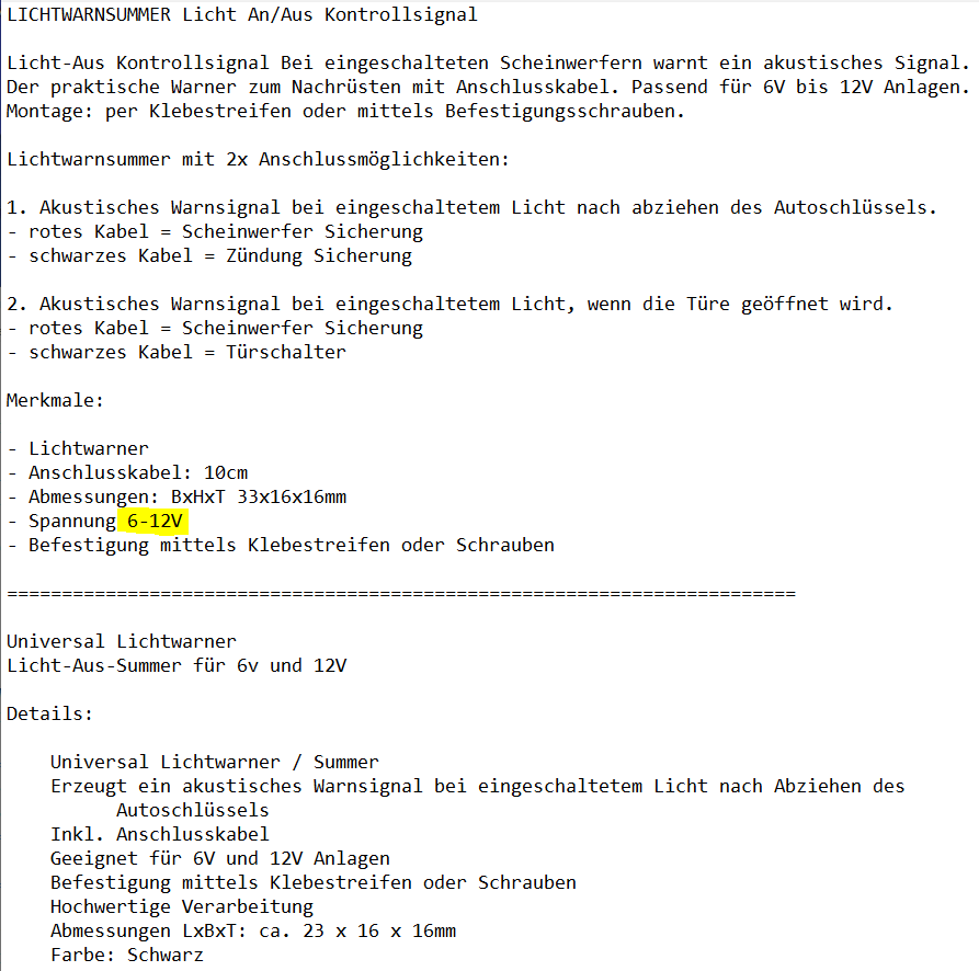 Der Summer selbst, bei eBay ca. 5 - 8 Euro, ist als 'Lichtwarner' ein gängiges Produkt. Wichtig ist, dass er 6-12 Volt abdeckt. In dieser Schaltung bekommt er 8 Volt.