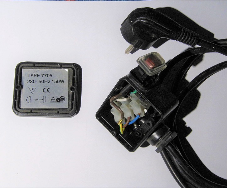 Eine passende Kunststoffbox (stammt von einem kleinen Baustrahler). Der Ein/Ausschalter ist drin geblieben damit die Öffnung verschlossen ist, hat aber keine Funktion.