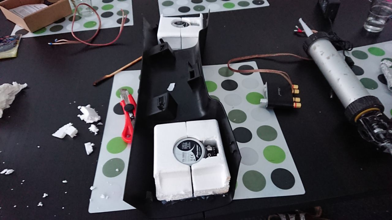 Für die Lautsprecher habe ich mir erst einen Holzadapter gesägt, den ich in die Lautsprecherbrücke einbauen wollte. Da ich aber kein Holz mehr für einen zweiten Adapter hatte und es Samstagabend war, wollte ich das ganze Zeugs erst wieder einpacken. Beim Einpacken fiel mir die Lösung dann wie Schuppen von den Augen. Die Lautsprecher wurden doch in erstklassigen Haltern geliefert: Passgenau und da wackelt nichts. Also einmal das Styroporteil aus der Verpackung halbiert und mit Silikon in die Brücke geklebt. Danach ins Fahrzeug gebaut. Fertig.