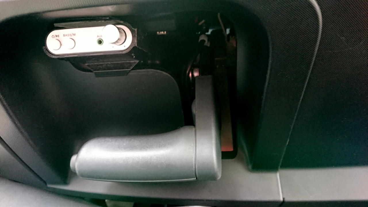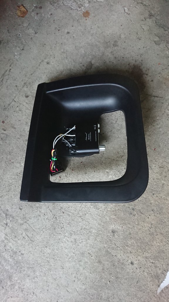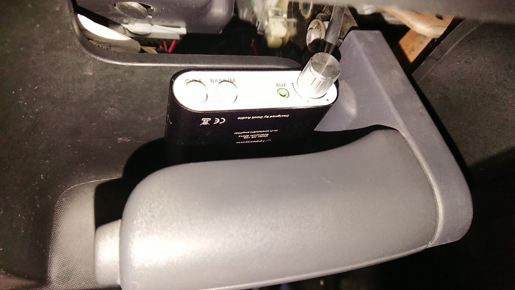 Dann habe ich den Verstärker mit Silikon auf die Verkleidung des Sicherungskastens geklebt und zwar an die Kante. So kann man ihn prima über der Handbremse ertasten aber nicht von außen sehen.