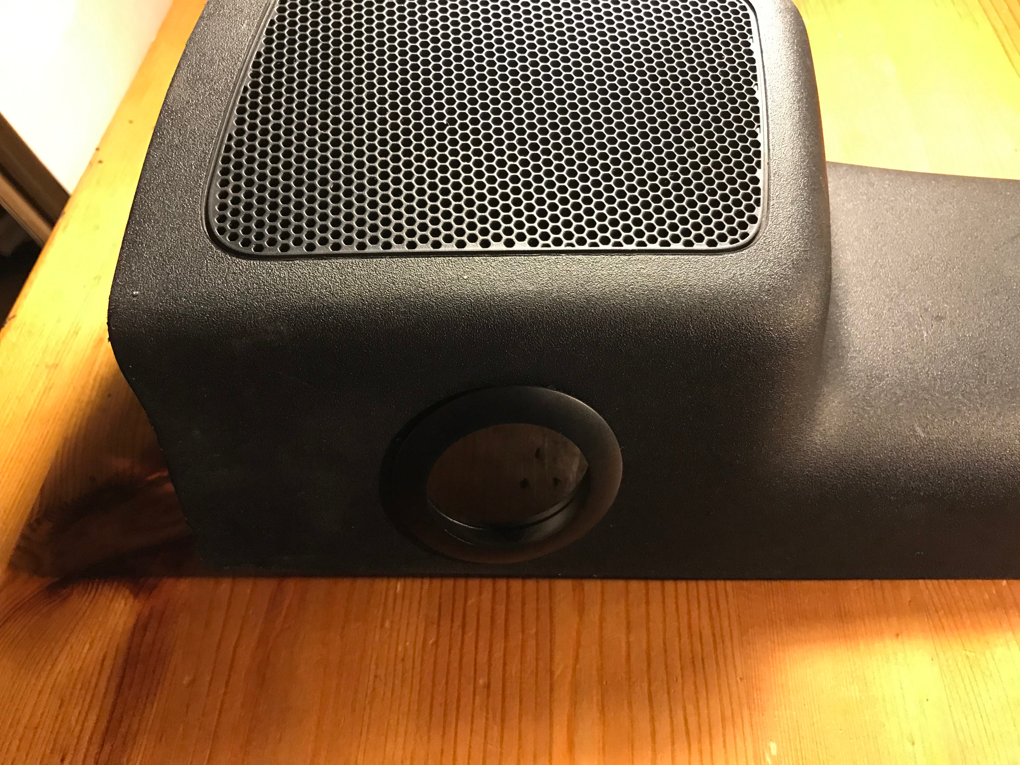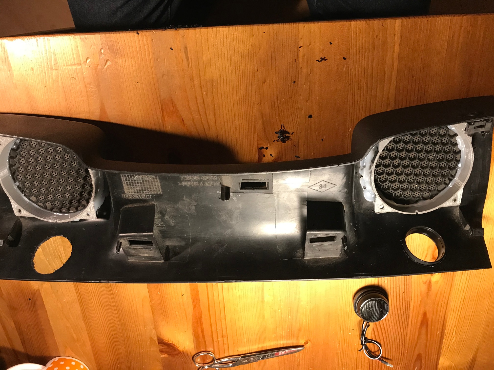 Da diese graue Halterung nun direkt auf dem Lautsprechergitter sitzt und darauf der Lautsprecher, kann der Schall nur nach unten, nur in eine Richtung, durch die Gitter aus der Verkleidung. Ein akustischer Kurzschluss ist so ausgeschlossen. Der graue Adapter, den man nun auf der Verkleidung mit Heißkleber fixiert hat, hat nebenbei auch die Funktion, dass die Lautsprechermembran genug Platz zum schwingen hat.