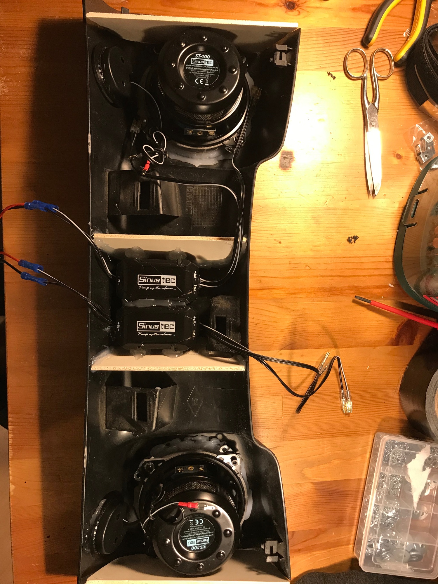 Anschließend werden die Frequenzweichen in der Mitte mit Heißkleber Fixiert, das ganze verkabelt und mit Lautsprecherdämmwolle ausgekleidet. FERTIG !