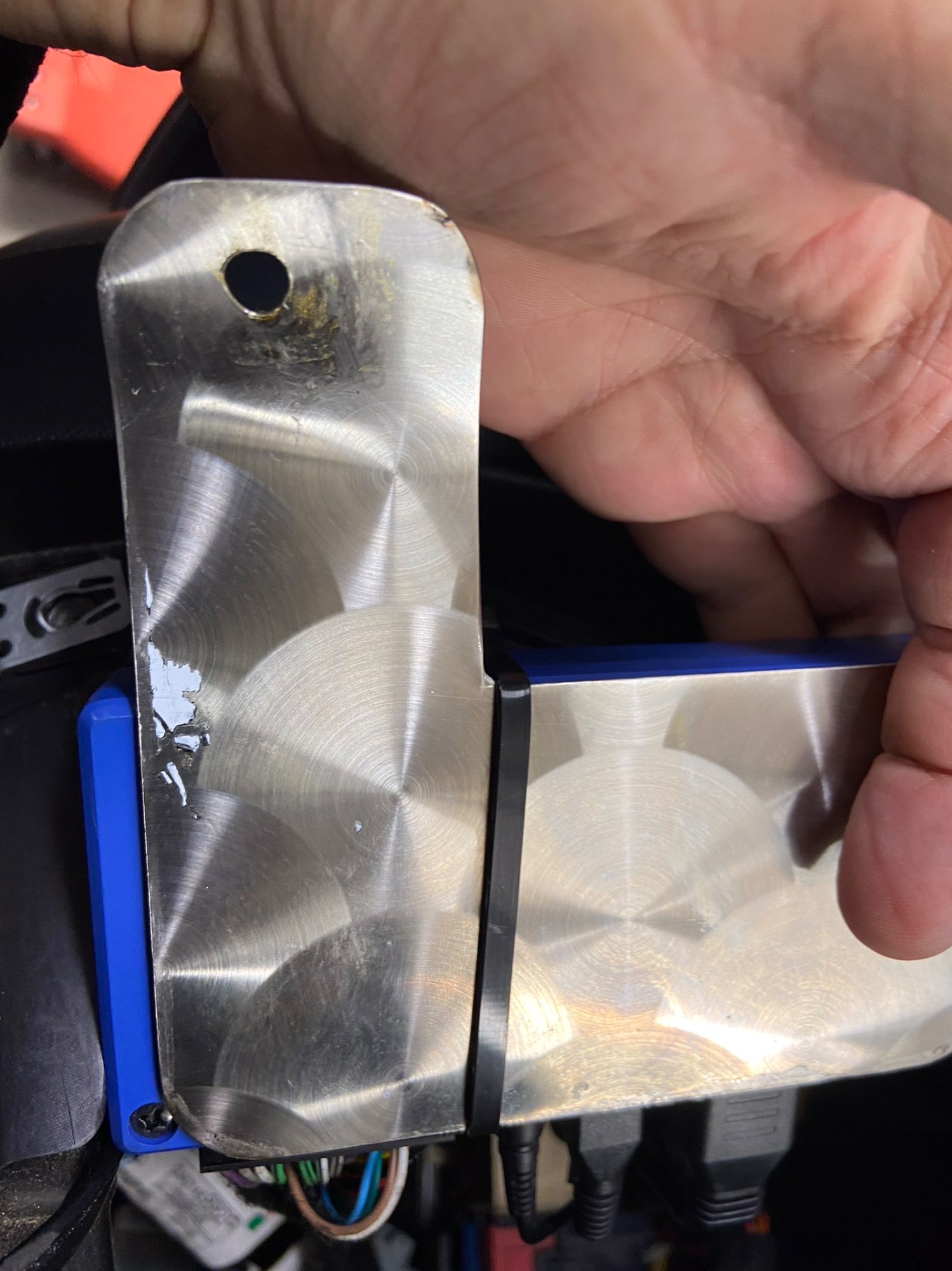Darum habe ich das Parrot im Twizy anders platziert. Dafür zuerst ein Blech geschnitten und mit 7mm Loch versehen.