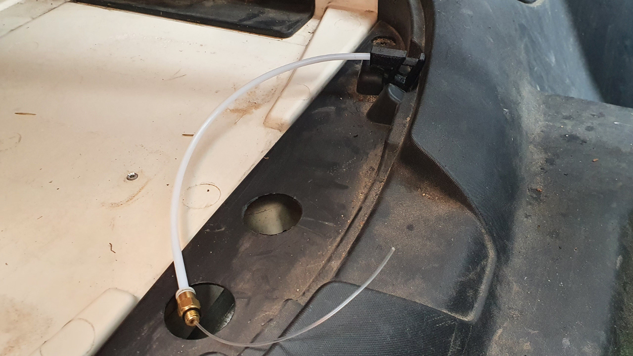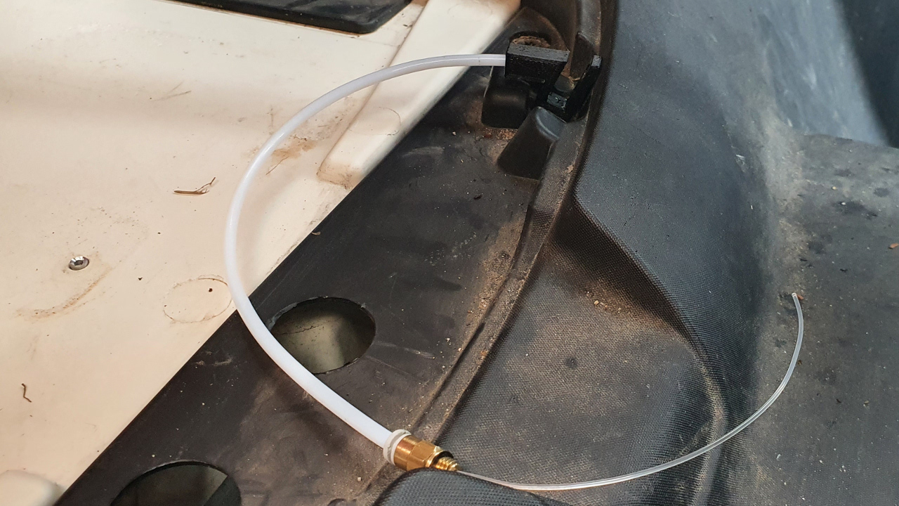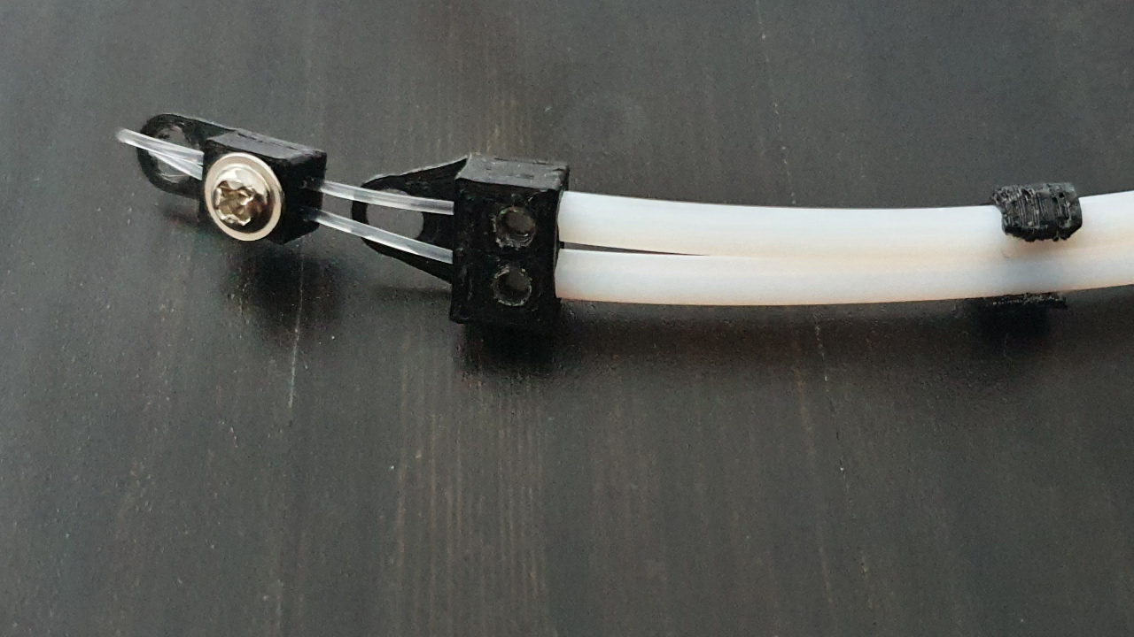 Man benötigt außerdem einen Bowdenzug vom 3D-Drucker. Dieser wird in den modifizierten Clip eingeführt und mit einer kleinen M3-Schraube darin befestigt (ich habe das Gewinde mit einem Gewindeschneider hereingeschnitten). Dann klebt man in dem Loch im Bolzen mit Sekundenkleber einen 1mm Nylon-Faden, der dann durch das Teil und den Bowdenzug gefädelt wird.