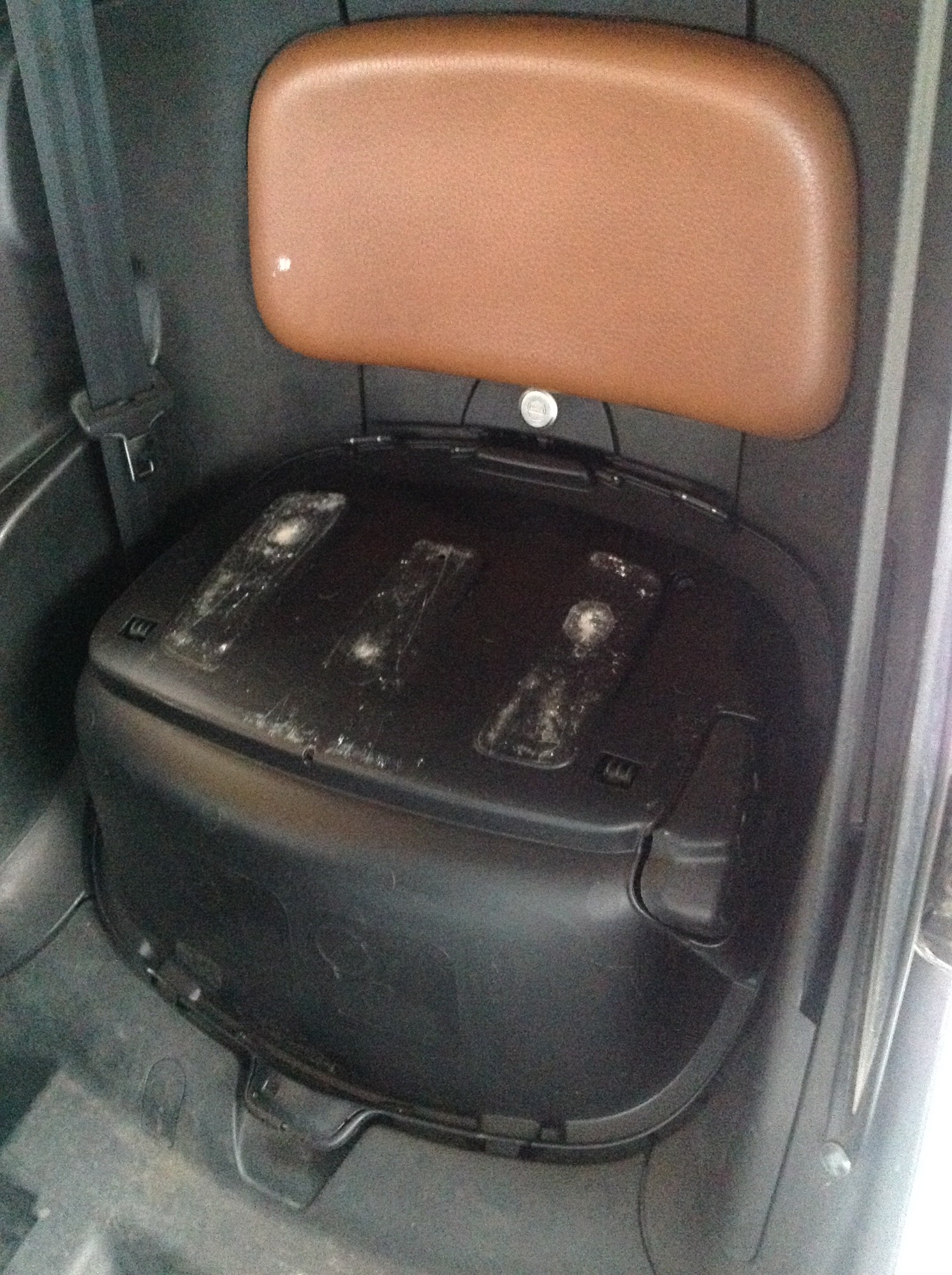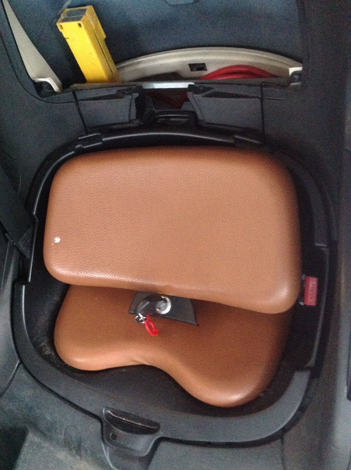Um das am Schloß zu befestigen müsste ich aber idealerweise den Mittelteil vom Rücksitz mit dem Schloss ausbauen. Ich frage mich nur wie das geht. Ich habe die zwei Schrauben oben rausgeschraubt. Aber das hing noch links und rechts in einem Clip und zwar ziemlich fest. Ich habe es dann erstmal gelassen.