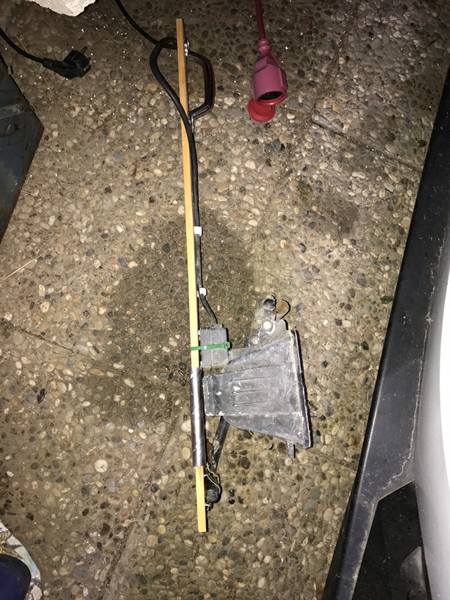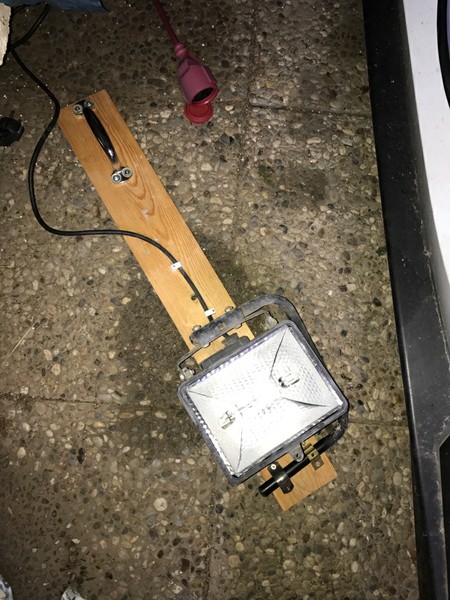 Einen alten Halogen-Baustraler auf ein Brett ( mit darunter liegendem Rest vom Alu-Lader-Abdeckblech) geschraubt und mittig unter den Akku geschoben. Musste noch das Schutzglas vom Strahler abbauen sonst hätte er nicht zwischen Akku und Boden (Carport) gepasst.