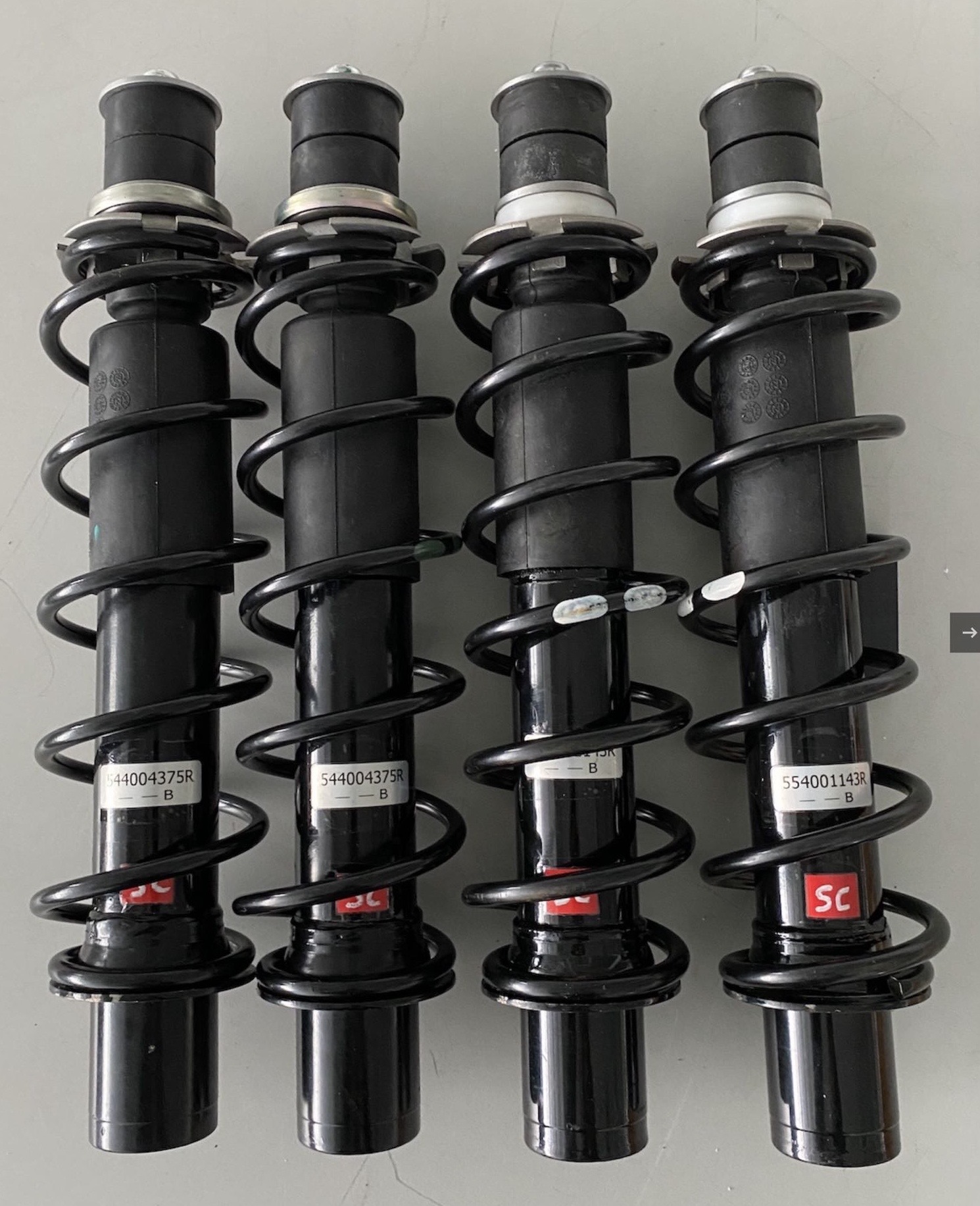 Also ich hatte auch den Verkäufer kontaktiert und mir wurde geschrieben, dass es Original Dämpfer und Federn sind und die Federwegsbegrenzer bearbeitet sind. Deshalb auch auf den Bildern kürzer. Und wie auf dem Bild zu sehen, scheint der dritte von links auch weiter oben zu sitzen.