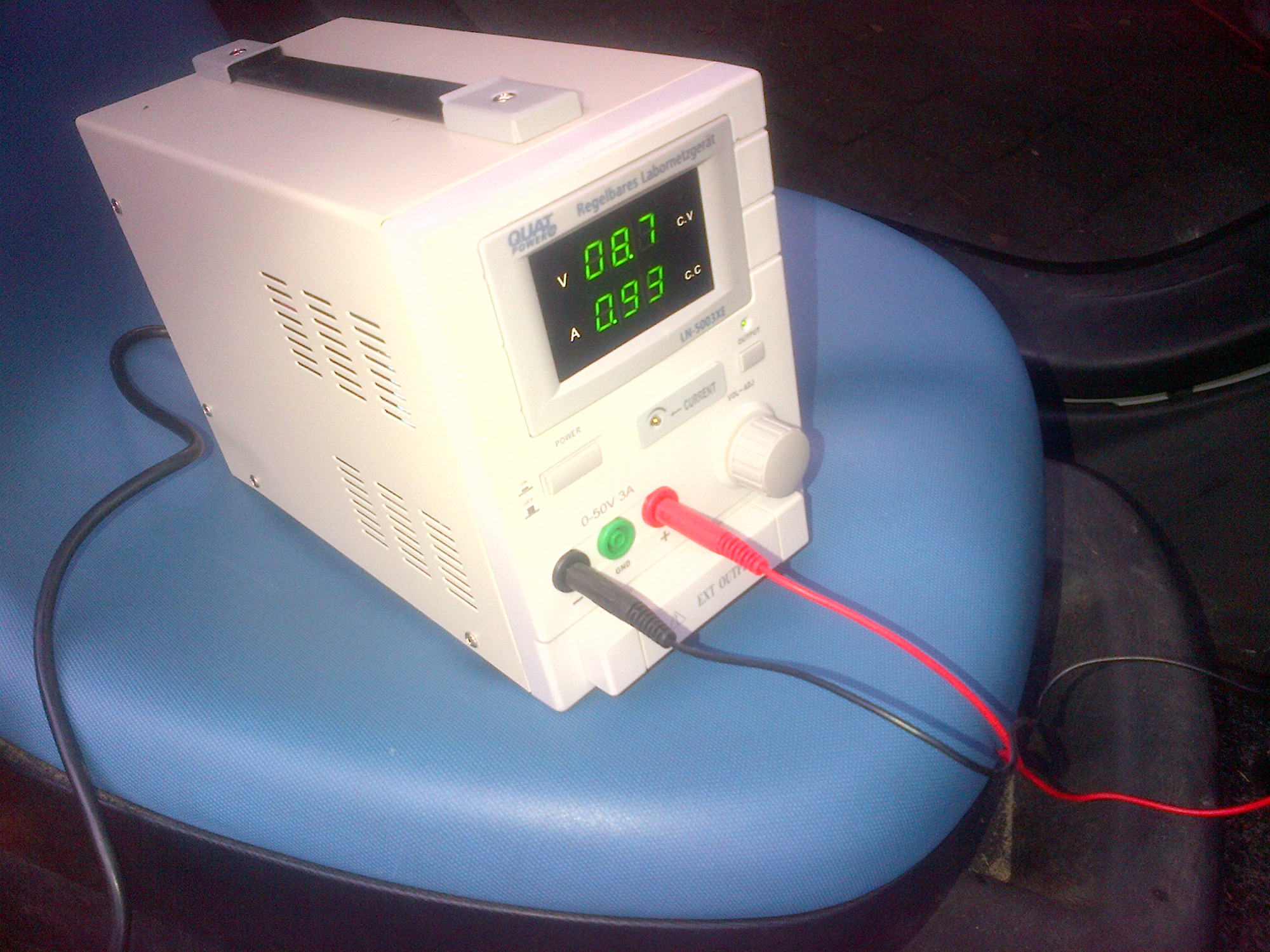 Labornetzteil angeschlossen ( hatte Angst, den Orginallader einzuschalten, wenn Bleianker zusammengebrochen, dann Orginallader vielleicht "puff" )